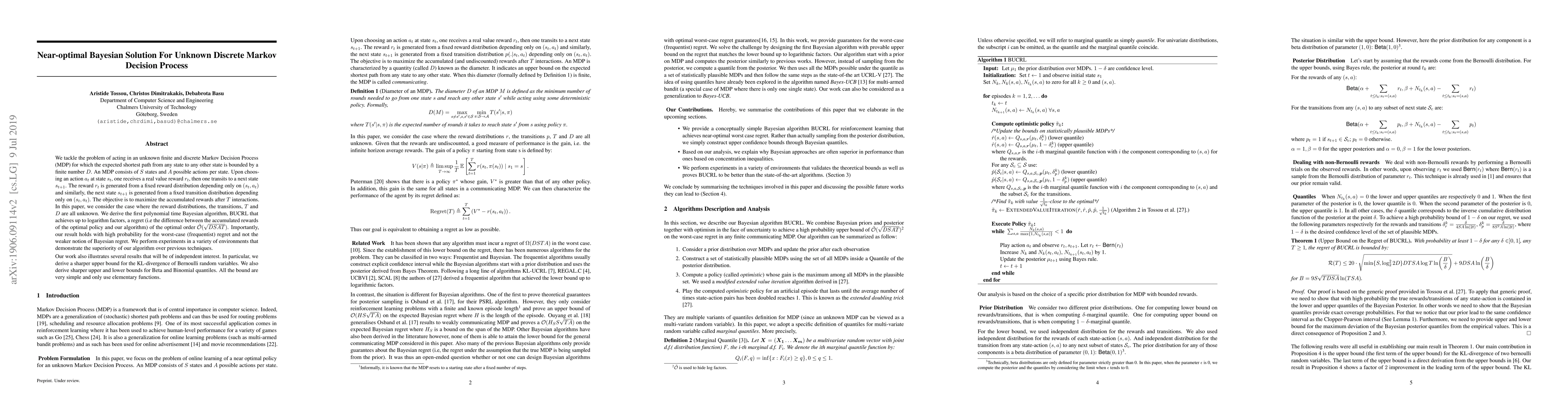 We tackle the problem of acting in an unknown finite and discrete Markov Decision Process (MDP) for which the expected shortest path from any state to any other state is bounded by a finite number $D$. An MDP consists of $S$ states and $A$ possible actions per state. Upon choosing an action $a_t$ at state $s_t$, one receives a real value reward $r_t$, then one transits to a next state $s_{t+1}$. The reward $r_t$ is generated from a fixed reward distribution depending only on $(s_t, a_t)$ and similarly, the next state $s_{t+1}$ is generated from a fixed transition distribution depending only on $(s_t, a_t)$. The objective is to maximize the accumulated rewards after $T$ interactions. In this paper, we consider the case where the reward distributions, the transitions, $T$ and $D$ are all unknown. We derive the first polynomial time Bayesian algorithm, BUCRL{} that achieves up to logarithm factors, a regret (i.e the difference between the accumulated rewards of the optimal policy and our algorithm) of the optimal order $\tilde{\mathcal{O}}(\sqrt{DSAT})$. Importantly, our result holds with high probability for the worst-case (frequentist) regret and not the weaker notion of Bayesian regret. We perform experiments in a variety of environments that demonstrate the superiority of our algorithm over previous techniques. Our work also illustrates several results that will be of independent interest. In particular, we derive a sharper upper bound for the KL-divergence of Bernoulli random variables. We also derive sharper upper and lower bounds for Beta and Binomial quantiles. All the bound are very simple and only use elementary functions.