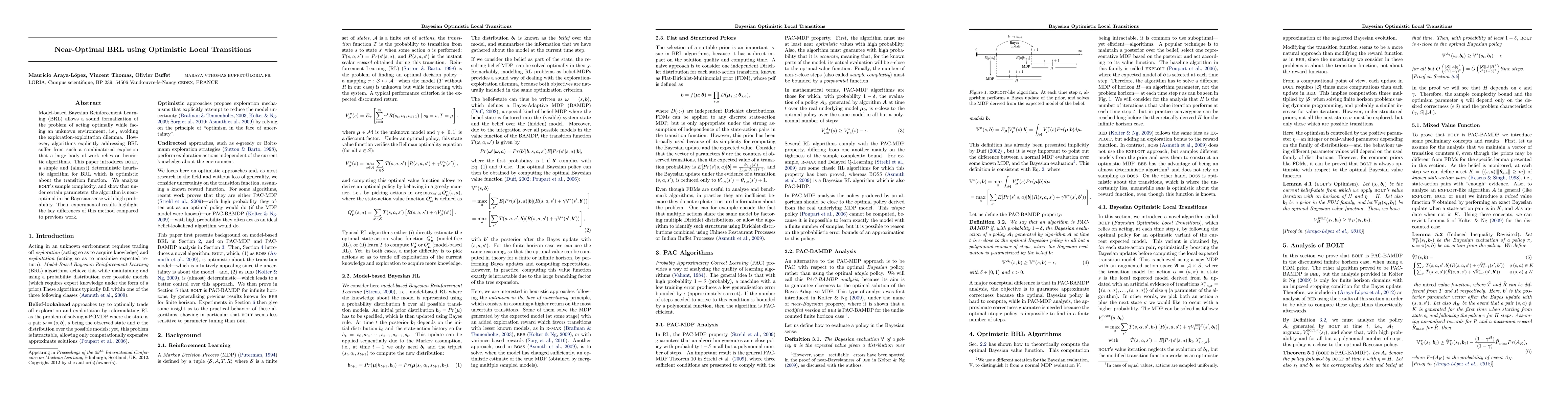 Model-based Bayesian Reinforcement Learning (BRL) allows a found formalization of the problem of acting optimally while facing an unknown environment, i.e., avoiding the exploration-exploitation dilemma. However, algorithms explicitly addressing BRL suffer from such a combinatorial explosion that a large body of work relies on heuristic algorithms. This paper introduces BOLT, a simple and (almost) deterministic heuristic algorithm for BRL which is optimistic about the transition function. We analyze BOLT's sample complexity, and show that under certain parameters, the algorithm is near-optimal in the Bayesian sense with high probability. Then, experimental results highlight the key differences of this method compared to previous work.
