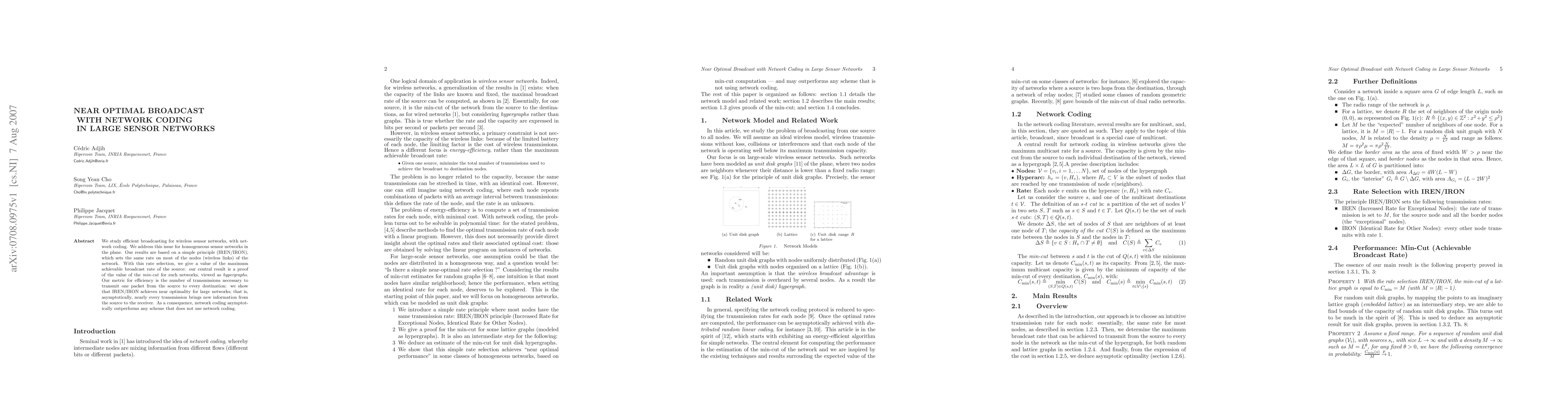 We study efficient broadcasting for wireless sensor networks, with network coding. We address this issue for homogeneous sensor networks in the plane. Our results are based on a simple principle (IREN/IRON), which sets the same rate on most of the nodes (wireless links) of the network. With this rate selection, we give a value of the maximum achievable broadcast rate of the source: our central result is a proof of the value of the min-cut for such networks, viewed as hypergraphs. Our metric for efficiency is the number of transmissions necessary to transmit one packet from the source to every destination: we show that IREN/IRON achieves near optimality for large networks; that is, asymptotically, nearly every transmission brings new information from the source to the receiver. As a consequence, network coding asymptotically outperforms any scheme that does not use network coding.