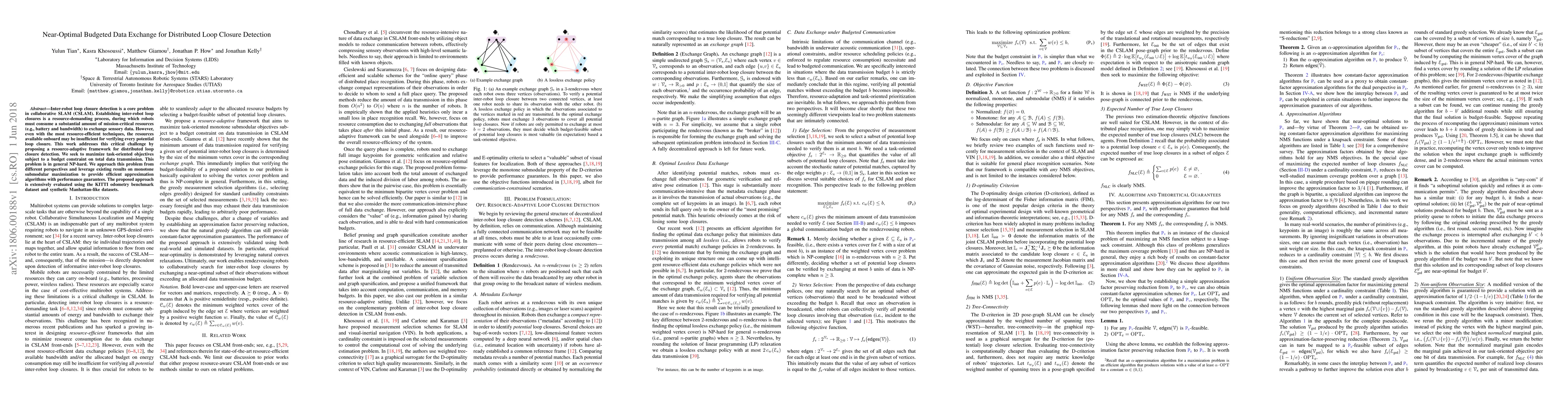 Researchers propose a new framework for efficient data exchange in collaborative SLAM, maximizing task objectives while adhering to a budget constraint on total transmission data. The approach provides near-optimal solutions with performance guarantees using approximation algorithms.