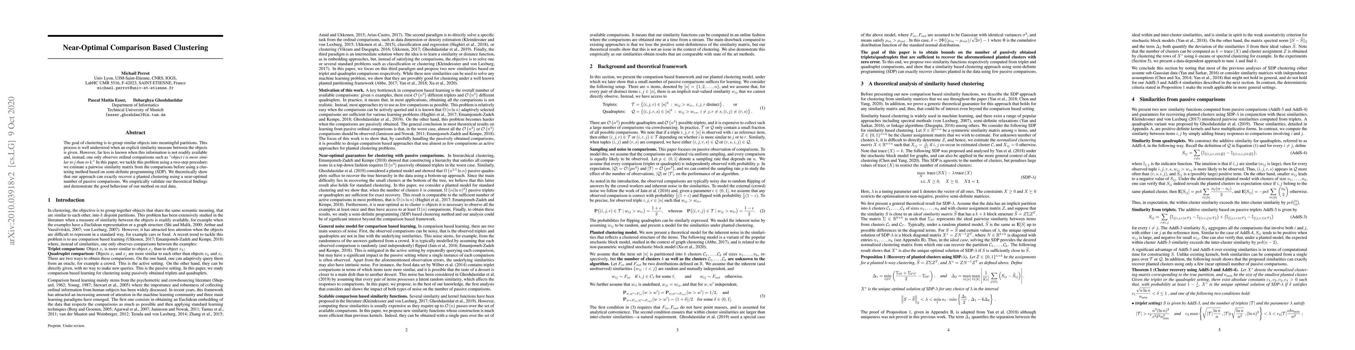 This paper proposes a two-step approach to clustering objects with ordinal comparisons, using a semi-definite programming method to estimate a pairwise similarity matrix and recover a planted clustering.