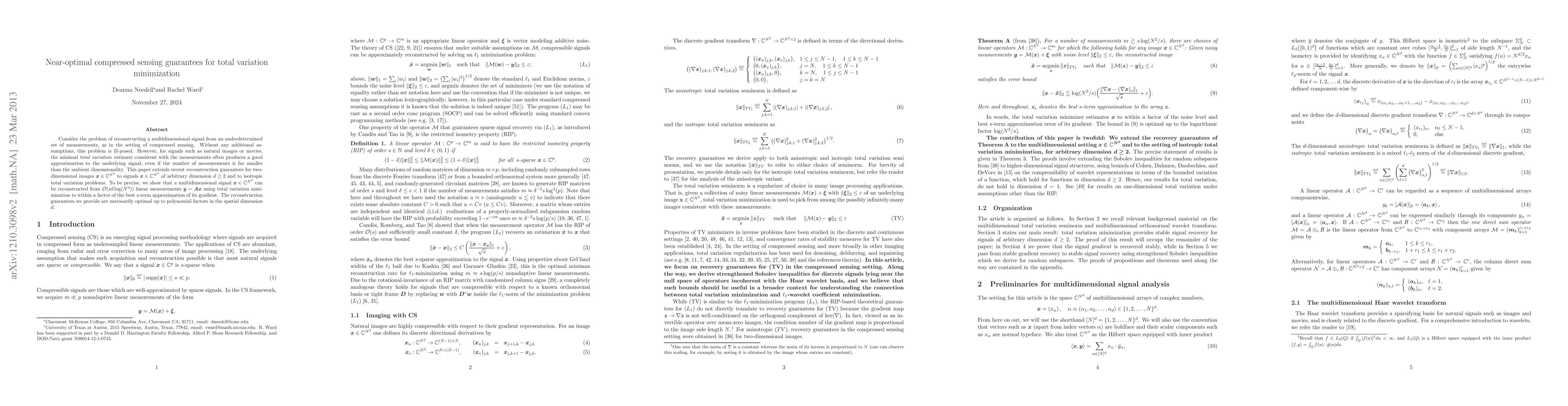 This paper presents near-optimal compressed sensing guarantees for reconstructing multidimensional signals using total variation minimization, extending previous results to arbitrary dimensions. It shows that O(sd*log(N^d)) measurements are sufficient for accurate reconstruction, with optimal guarantees up to polynomial factors in the spatial dimension d.