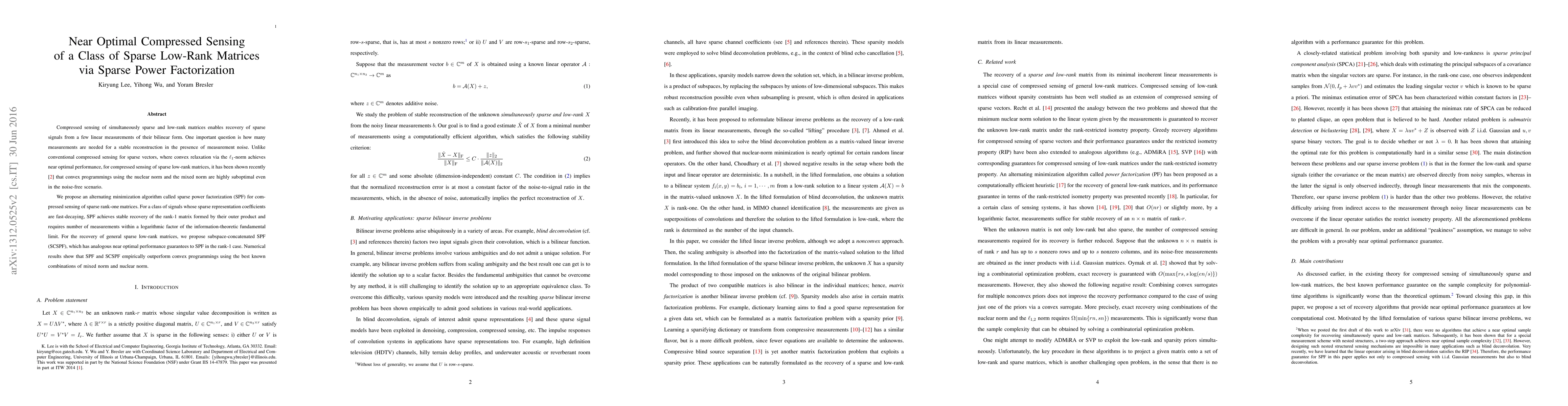 This paper proposes an alternating minimization algorithm called sparse power factorization (SPF) for compressed sensing of sparse rank-one matrices, achieving near optimal performance in terms of measurement requirements. It also introduces subspace-concatenated SPF (SCSPF) for general sparse low-rank matrices, showing empirical outperformance over existing convex programming methods.