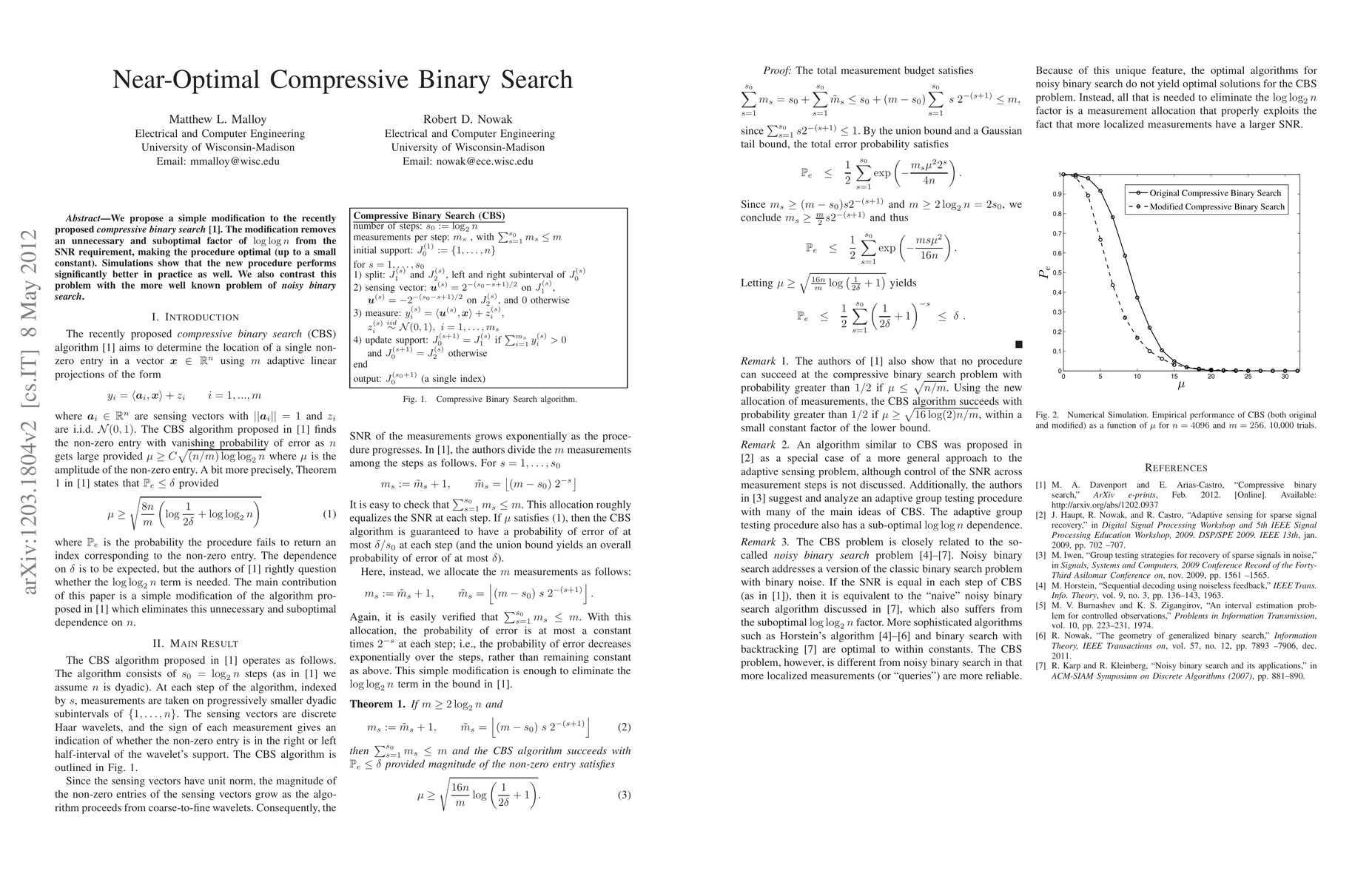 Researchers improved compressive binary search by removing a suboptimal factor, achieving near-optimal performance with significant practical benefits.