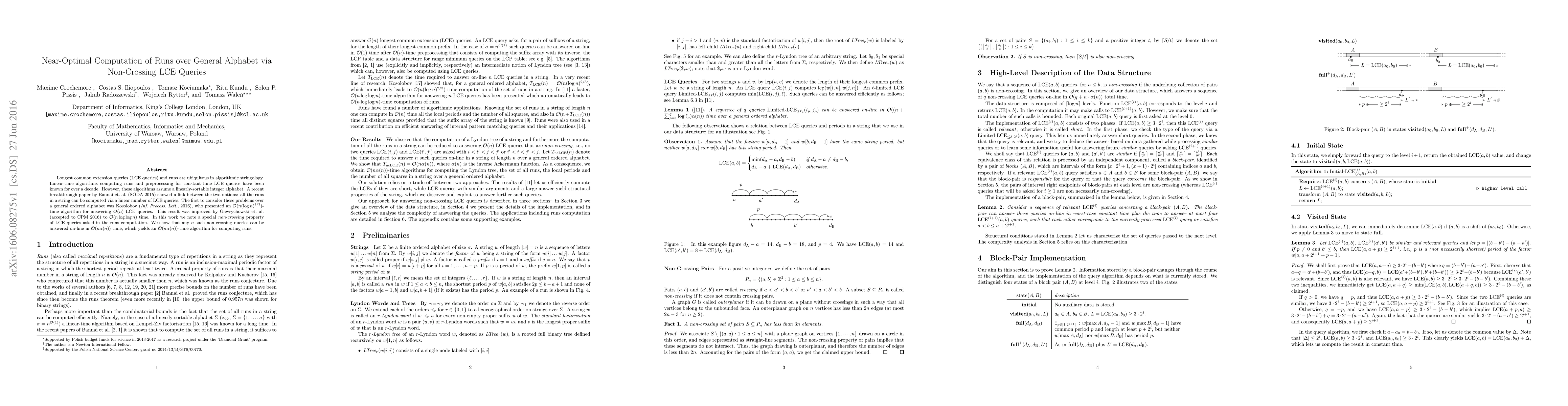 Longest common extension queries (LCE queries) and runs are ubiquitous in algorithmic stringology. Linear-time algorithms computing runs and preprocessing for constant-time LCE queries have been known for over a decade. However, these algorithms assume a linearly-sortable integer alphabet. A recent breakthrough paper by Bannai et.\ al.\ (SODA 2015) showed a link between the two notions: all the runs in a string can be computed via a linear number of LCE queries. The first to consider these problems over a general ordered alphabet was Kosolobov (\emph{Inf.\ Process.\ Lett.}, 2016), who presented an $O(n (\log n)^{2/3})$-time algorithm for answering $O(n)$ LCE queries. This result was improved by Gawrychowski et.\ al.\ (accepted to CPM 2016) to $O(n \log \log n)$ time. In this work we note a special \emph{non-crossing} property of LCE queries asked in the runs computation. We show that any $n$ such non-crossing queries can be answered on-line in $O(n \alpha(n))$ time, which yields an $O(n \alpha(n))$-time algorithm for computing runs.