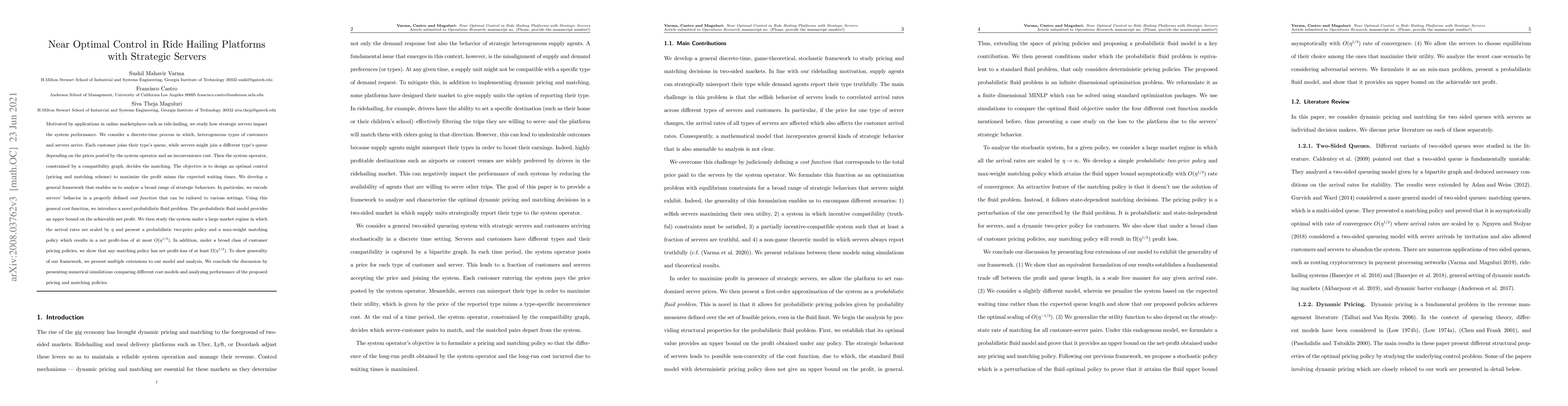 This research presents a framework analyzing strategic server behavior in ride-hailing platforms to optimize profits. Utilizing a cost function to model server actions, the study introduces a probabilistic fluid model providing an upper bound on net profit. It proposes a two-price policy and a max-weight matching policy, achieving a near-optimal net profit-loss of O(η^(1/3)). The analysis also demonstrates a lower bound of Ω(η^(1/3)) for any matching policy under broad customer pricing policies.
