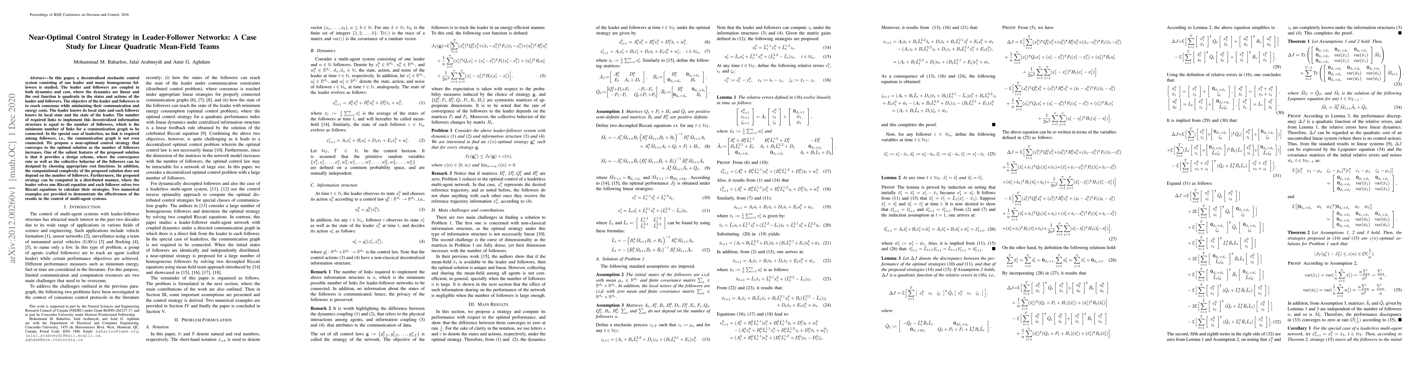 In this paper, a decentralized stochastic control system consisting of one leader and many homogeneous followers is studied. The leader and followers are coupled in both dynamics and cost, where the dynamics are linear and the cost function is quadratic in the states and actions of the leader and followers. The objective of the leader and followers is to reach consensus while minimizing their communication and energy costs. The leader knows its local state and each follower knows its local state and the state of the leader. The number of required links to implement this decentralized information structure is equal to the number of followers, which is the minimum number of links for a communication graph to be connected. In the special case of leaderless, no link is required among followers, i.e., the communication graph is not even connected. We propose a near-optimal control strategy that converges to the optimal solution as the number of followers increases. One of the salient features of the proposed solution is that it provides a design scheme, where the convergence rate \edit{as well as} the collective behavior of the followers can be designed by choosing appropriate cost functions. In addition, the computational complexity of the proposed solution does not depend on the number of followers. Furthermore, the proposed strategy can be computed in a distributed manner, where the leader solves one Riccati equation and each follower solves two Riccati equations to calculate their strategies. Two numerical examples are provided to demonstrate the effectiveness of the results in the control of multi-agent systems.