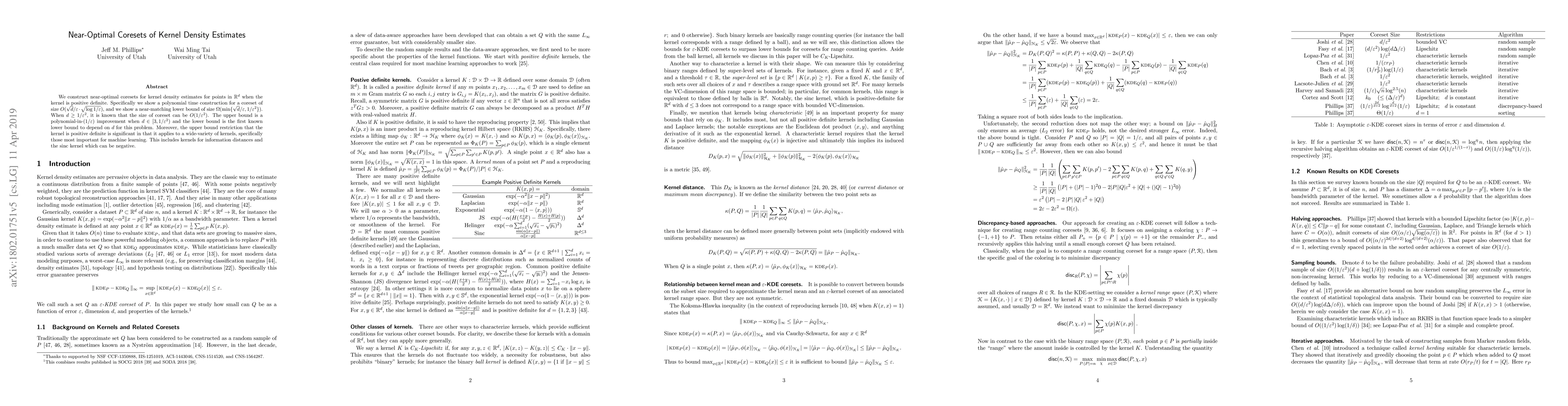 This paper constructs near-optimal coresets for kernel density estimates in $\mathbb{R}^d$ with positive definite kernels, achieving a polynomial time construction of size $O(\sqrt{d}/\varepsilon\cdot \sqrt{\log 1/\varepsilon})$. It also provides a near-matching lower bound and demonstrates improvements over previous bounds for certain dimensions.