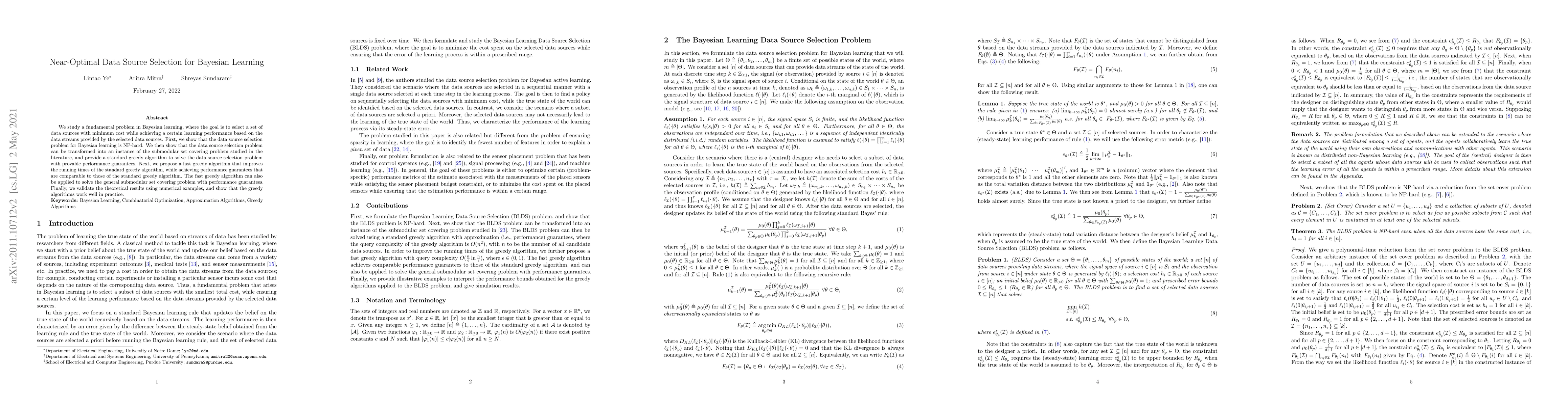 We study a fundamental problem in Bayesian learning, where the goal is to select a set of data sources with minimum cost while achieving a certain learning performance based on the data streams provided by the selected data sources. First, we show that the data source selection problem for Bayesian learning is NP-hard. We then show that the data source selection problem can be transformed into an instance of the submodular set covering problem studied in the literature, and provide a standard greedy algorithm to solve the data source selection problem with provable performance guarantees. Next, we propose a fast greedy algorithm that improves the running times of the standard greedy algorithm, while achieving performance guarantees that are comparable to those of the standard greedy algorithm. The fast greedy algorithm can also be applied to solve the general submodular set covering problem with performance guarantees. Finally, we validate the theoretical results using numerical examples, and show that the greedy algorithms work well in practice.