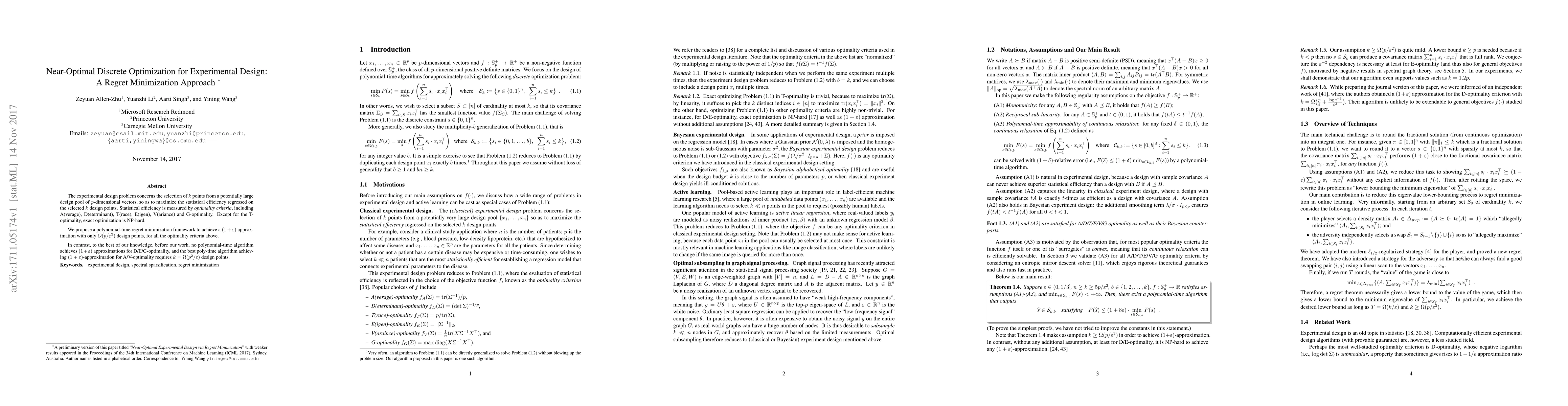 The experimental design problem concerns the selection of k points from a potentially large design pool of p-dimensional vectors, so as to maximize the statistical efficiency regressed on the selected k design points. Statistical efficiency is measured by optimality criteria, including A(verage), D(eterminant), T(race), E(igen), V(ariance) and G-optimality. Except for the T-optimality, exact optimization is NP-hard. We propose a polynomial-time regret minimization framework to achieve a $(1+\varepsilon)$ approximation with only $O(p/\varepsilon^2)$ design points, for all the optimality criteria above. In contrast, to the best of our knowledge, before our work, no polynomial-time algorithm achieves $(1+\varepsilon)$ approximations for D/E/G-optimality, and the best poly-time algorithm achieving $(1+\varepsilon)$-approximation for A/V-optimality requires $k = \Omega(p^2/\varepsilon)$ design points.