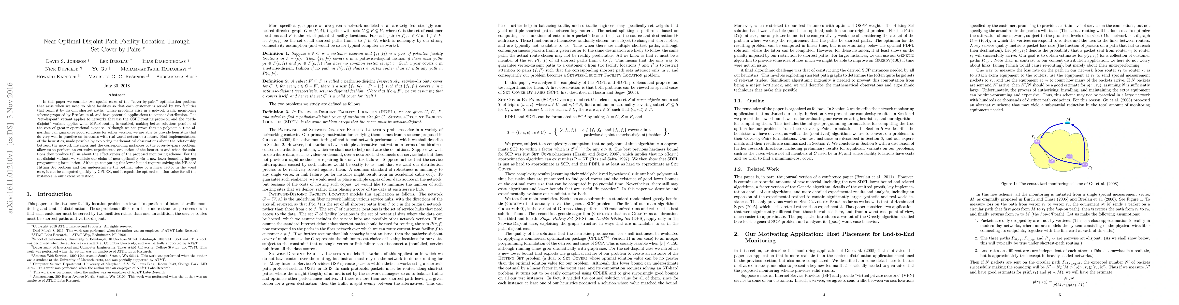 In this paper we consider two special cases of the "cover-by-pairs" optimization problem that arise when we need to place facilities so that each customer is served by two facilities that reach it by disjoint shortest paths. These problems arise in a network traffic monitoring scheme proposed by Breslau et al. and have potential applications to content distribution. The "set-disjoint" variant applies to networks that use the OSPF routing protocol, and the "path-disjoint" variant applies when MPLS routing is enabled, making better solutions possible at the cost of greater operational expense. Although we can prove that no polynomial-time algorithm can guarantee good solutions for either version, we are able to provide heuristics that do very well in practice on instances with real-world network structure. Fast implementations of the heuristics, made possible by exploiting mathematical observations about the relationship between the network instances and the corresponding instances of the cover-by-pairs problem, allow us to perform an extensive experimental evaluation of the heuristics and what the solutions they produce tell us about the effectiveness of the proposed monitoring scheme. For the set-disjoint variant, we validate our claim of near-optimality via a new lower-bounding integer programming formulation. Although computing this lower bound requires solving the NP-hard Hitting Set problem and can underestimate the optimal value by a linear factor in the worst case, it can be computed quickly by CPLEX, and it equals the optimal solution value for all the instances in our extensive testbed.