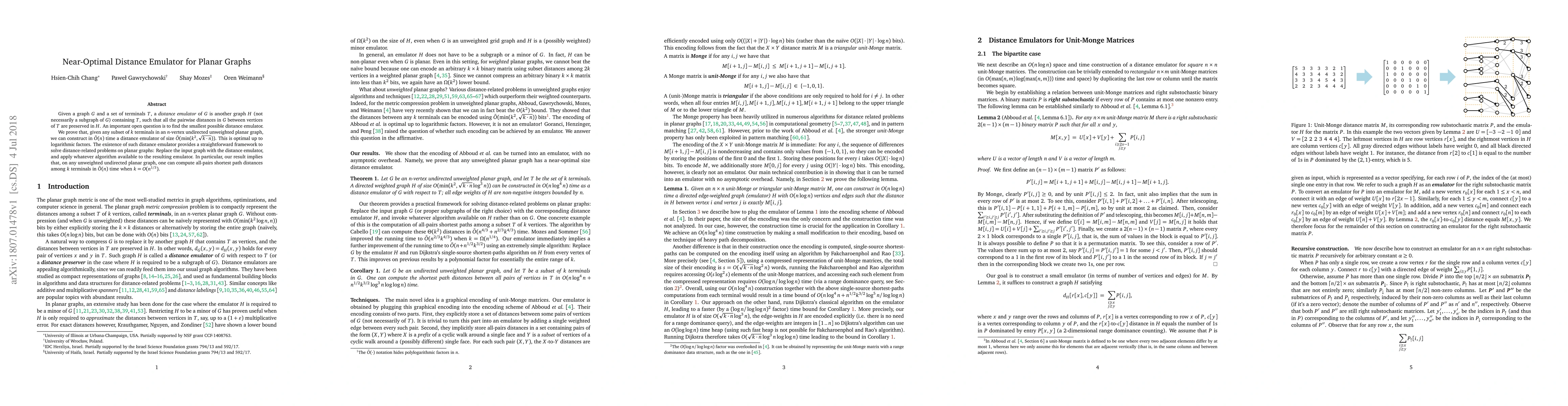 The research presents a method to construct a near-optimal distance emulator for planar graphs with a size of O(min(k^2, sqrt(k*n))), achieved in near-linear time. This solution is nearly optimal up to logarithmic factors and offers a framework to efficiently solve distance-related problems on planar graphs, such as computing all-pairs shortest path distances among k terminals in O(n) time when k is O(n^(1/3)).