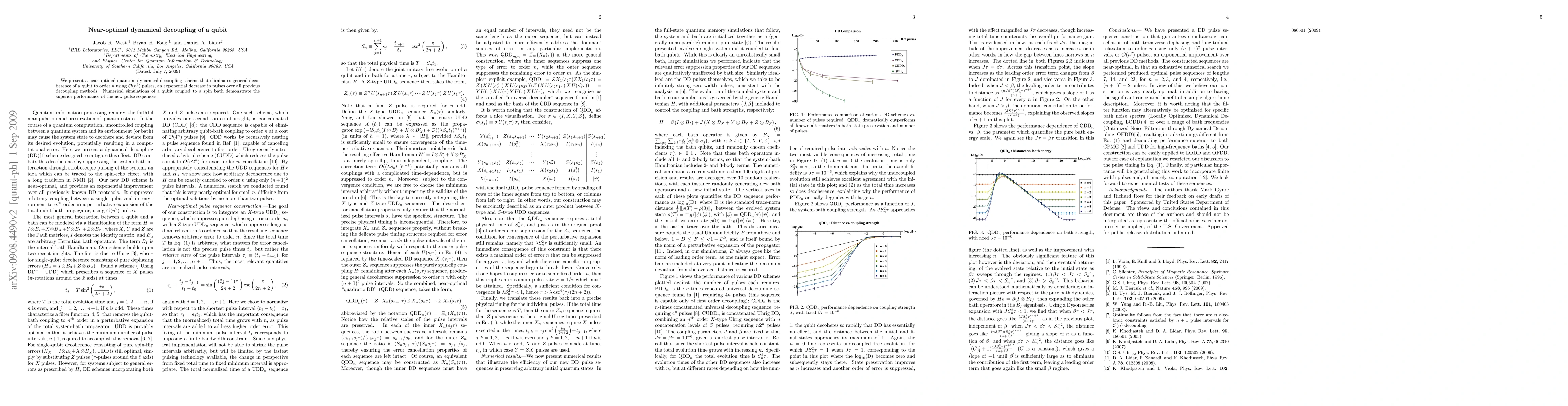 This paper introduces a near-optimal quantum dynamical decoupling method that reduces qubit decoherence to order n using O(n^2) pulses, significantly fewer than previous methods. Numerical simulations show improved performance in decoupling a qubit coupled to a spin bath.