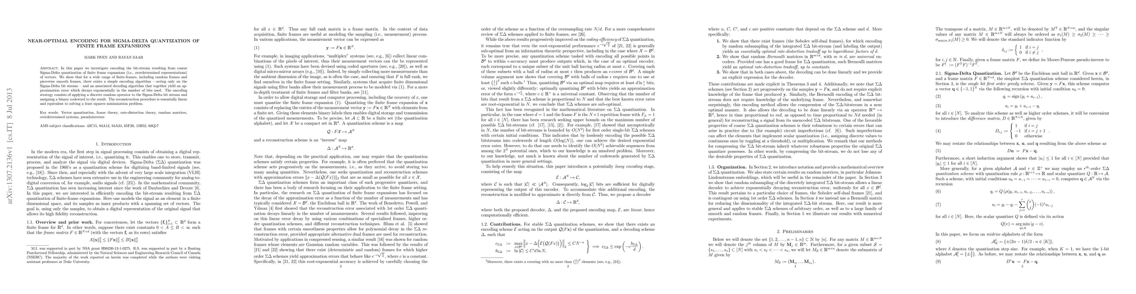 This paper presents an encoding method for the bit-stream from Sigma-Delta quantization of finite frame expansions, demonstrating exponential decay in approximation error with the number of bits. The encoding uses a discrete random operator, followed by a linear decoding procedure akin to least squares minimization.