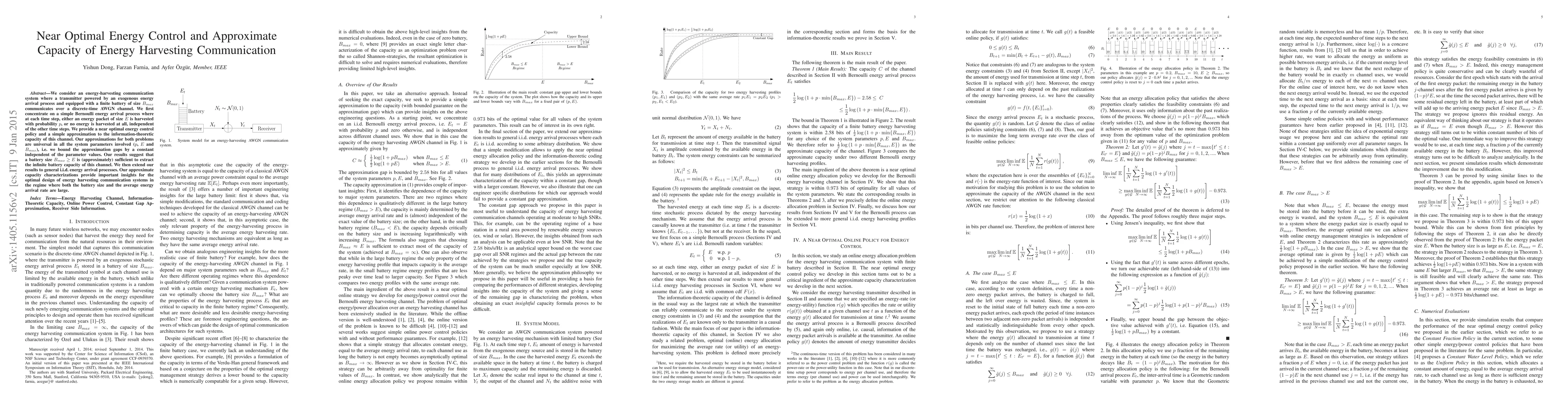 We consider an energy-harvesting communication system where a transmitter powered by an exogenous energy arrival process and equipped with a finite battery of size $B_{max}$ communicates over a discrete-time AWGN channel. We first concentrate on a simple Bernoulli energy arrival process where at each time step, either an energy packet of size $E$ is harvested with probability $p$, or no energy is harvested at all, independent of the other time steps. We provide a near optimal energy control policy and a simple approximation to the information-theoretic capacity of this channel. Our approximations for both problems are universal in all the system parameters involved ($p$, $E$ and $B_{max}$), i.e. we bound the approximation gaps by a constant independent of the parameter values. Our results suggest that a battery size $B_{max}\geq E$ is (approximately) sufficient to extract the infinite battery capacity of this channel. We then extend our results to general i.i.d. energy arrival processes. Our approximate capacity characterizations provide important insights for the optimal design of energy harvesting communication systems in the regime where both the battery size and the average energy arrival rate are large.