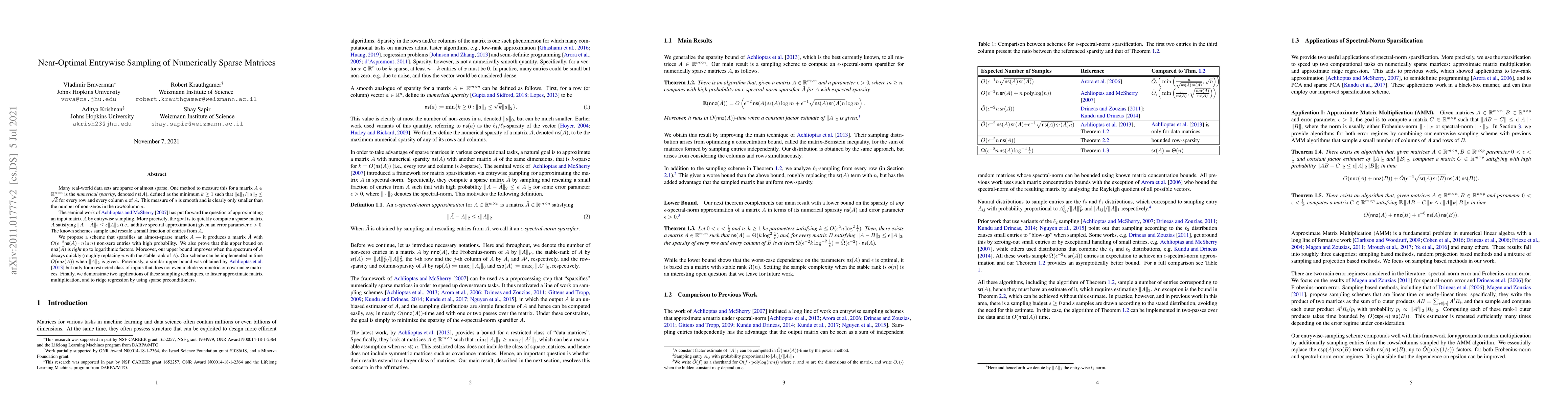 Researchers have developed a method to efficiently sample nearly sparse matrices, resulting in a sparse matrix with a number of non-zero entries that improves upon existing methods by up to $O( ext{error}^{-2} imes ext{numerical sparsity})$.