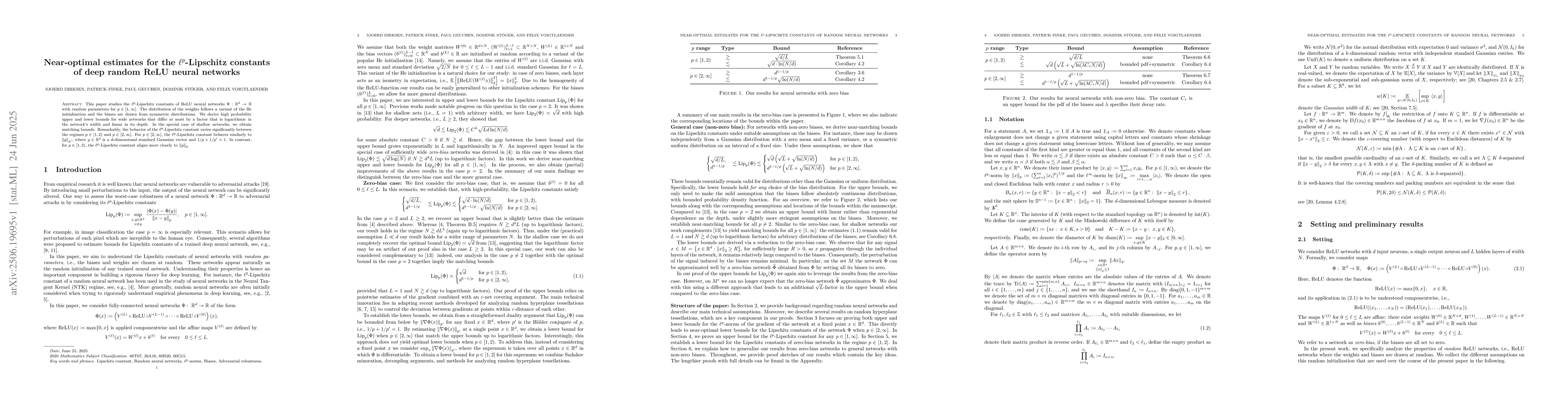 This paper studies the $\ell^p$-Lipschitz constants of ReLU neural networks $\Phi: \mathbb{R}^d \to \mathbb{R}$ with random parameters for $p \in [1,\infty]$. The distribution of the weights follows a variant of the He initialization and the biases are drawn from symmetric distributions. We derive high probability upper and lower bounds for wide networks that differ at most by a factor that is logarithmic in the network's width and linear in its depth. In the special case of shallow networks, we obtain matching bounds. Remarkably, the behavior of the $\ell^p$-Lipschitz constant varies significantly between the regimes $ p \in [1,2) $ and $ p \in [2,\infty] $. For $p \in [2,\infty]$, the $\ell^p$-Lipschitz constant behaves similarly to $\Vert g\Vert_{p'}$, where $g \in \mathbb{R}^d$ is a $d$-dimensional standard Gaussian vector and $1/p + 1/p' = 1$. In contrast, for $p \in [1,2)$, the $\ell^p$-Lipschitz constant aligns more closely to $\Vert g \Vert_{2}$.