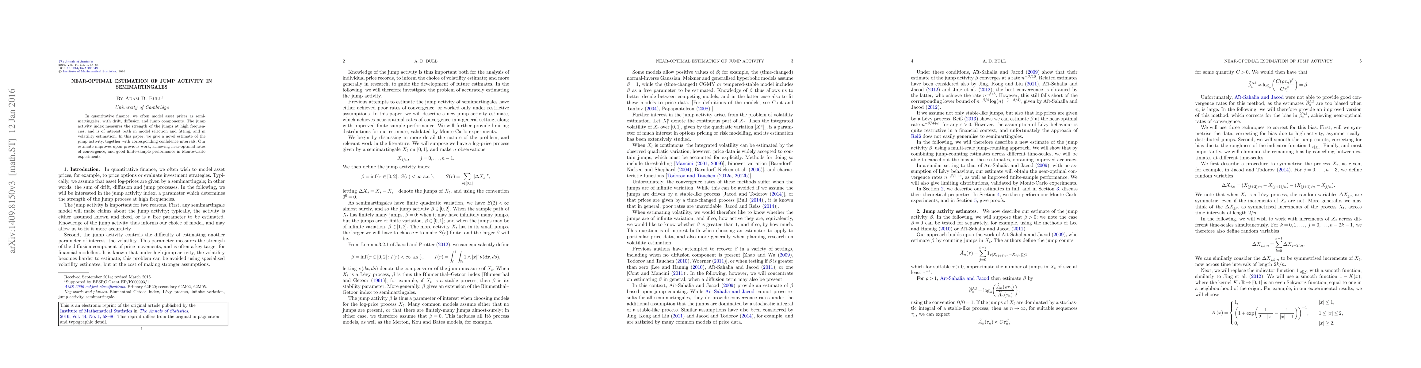 This paper presents a novel near-optimal estimator for the jump activity index in semimartingale models used in quantitative finance, offering improved convergence rates and robust performance in Monte Carlo simulations. The proposed method enhances both model selection and volatility estimation.