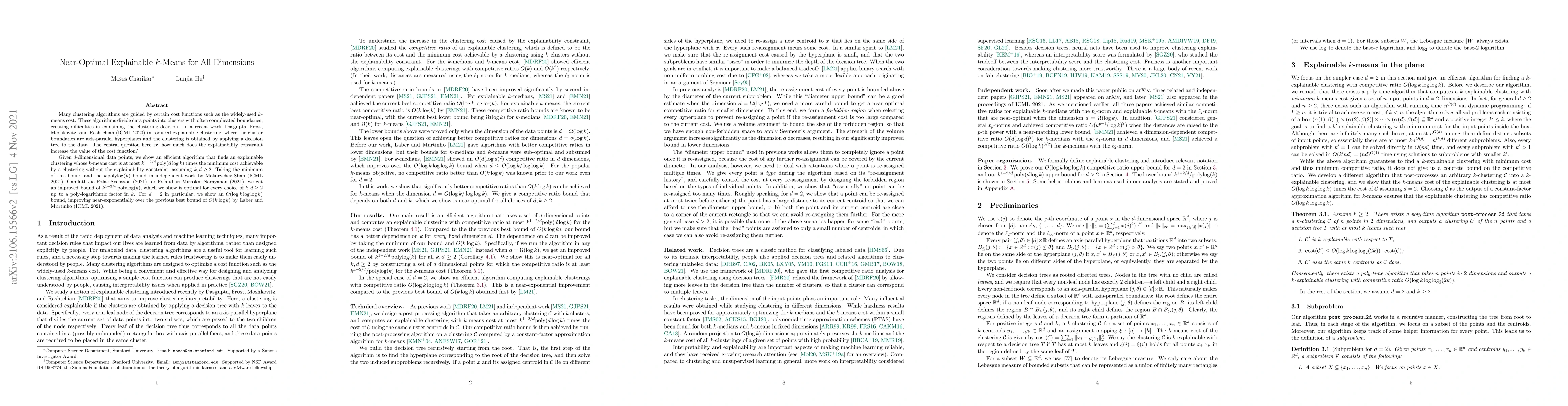 Many clustering algorithms are guided by certain cost functions such as the widely-used $k$-means cost. These algorithms divide data points into clusters with often complicated boundaries, creating difficulties in explaining the clustering decision. In a recent work, Dasgupta, Frost, Moshkovitz, and Rashtchian (ICML 2020) introduced explainable clustering, where the cluster boundaries are axis-parallel hyperplanes and the clustering is obtained by applying a decision tree to the data. The central question here is: how much does the explainability constraint increase the value of the cost function? Given $d$-dimensional data points, we show an efficient algorithm that finds an explainable clustering whose $k$-means cost is at most $k^{1 - 2/d}\,\mathrm{poly}(d\log k)$ times the minimum cost achievable by a clustering without the explainability constraint, assuming $k,d\ge 2$. Taking the minimum of this bound and the $k\,\mathrm{polylog} (k)$ bound in independent work by Makarychev-Shan (ICML 2021), Gamlath-Jia-Polak-Svensson (2021), or Esfandiari-Mirrokni-Narayanan (2021), we get an improved bound of $k^{1 - 2/d}\,\mathrm{polylog}(k)$, which we show is optimal for every choice of $k,d\ge 2$ up to a poly-logarithmic factor in $k$. For $d = 2$ in particular, we show an $O(\log k\log\log k)$ bound, improving near-exponentially over the previous best bound of $O(k\log k)$ by Laber and Murtinho (ICML 2021).