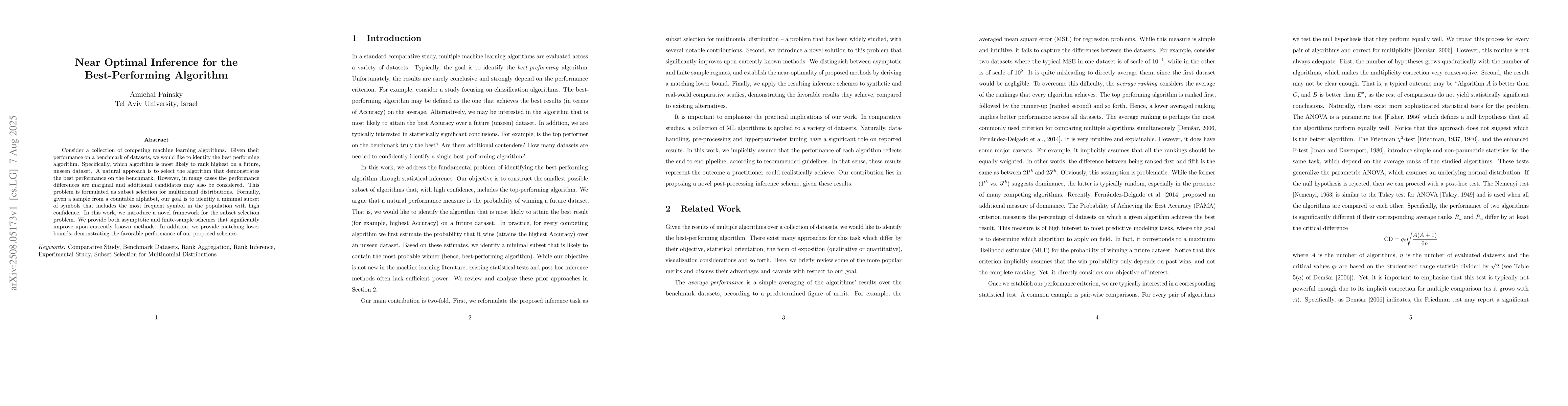 Consider a collection of competing machine learning algorithms. Given their performance on a benchmark of datasets, we would like to identify the best performing algorithm. Specifically, which algorithm is most likely to rank highest on a future, unseen dataset. A natural approach is to select the algorithm that demonstrates the best performance on the benchmark. However, in many cases the performance differences are marginal and additional candidates may also be considered. This problem is formulated as subset selection for multinomial distributions. Formally, given a sample from a countable alphabet, our goal is to identify a minimal subset of symbols that includes the most frequent symbol in the population with high confidence. In this work, we introduce a novel framework for the subset selection problem. We provide both asymptotic and finite-sample schemes that significantly improve upon currently known methods. In addition, we provide matching lower bounds, demonstrating the favorable performance of our proposed schemes.