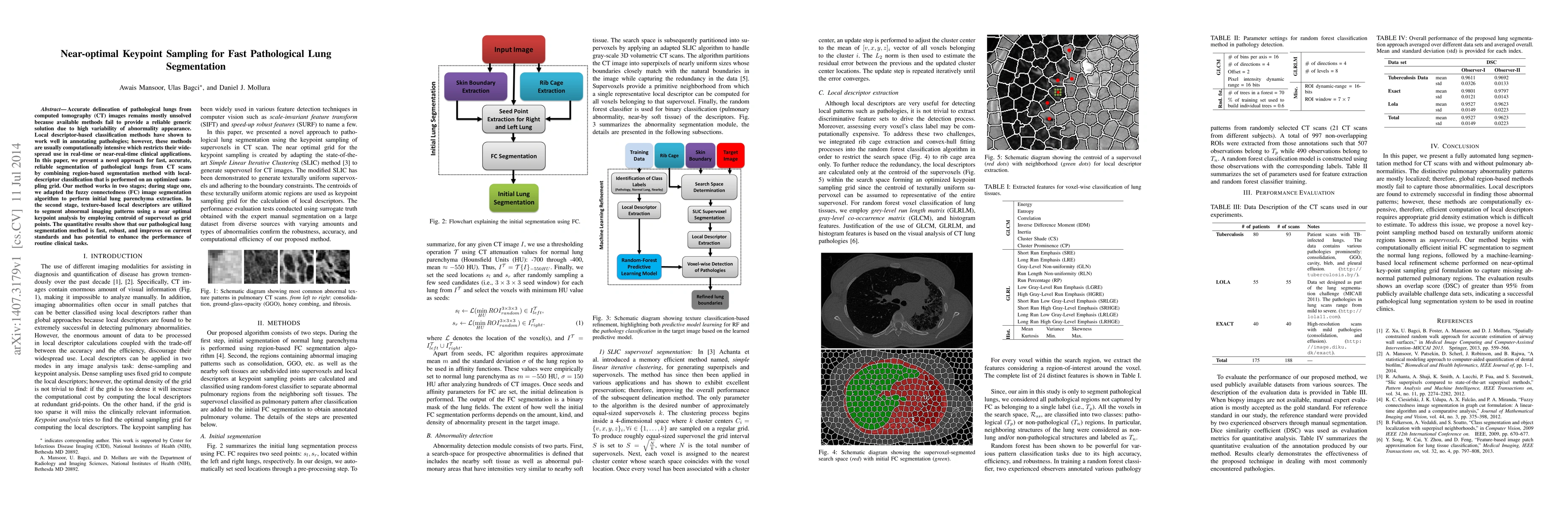 This paper proposes a two-stage method for fast and accurate segmentation of pathological lungs in CT scans, combining region-based segmentation with optimized local descriptor classification on a keypoint sampling grid. The method shows improved performance over current standards, offering potential for enhancing routine clinical tasks.