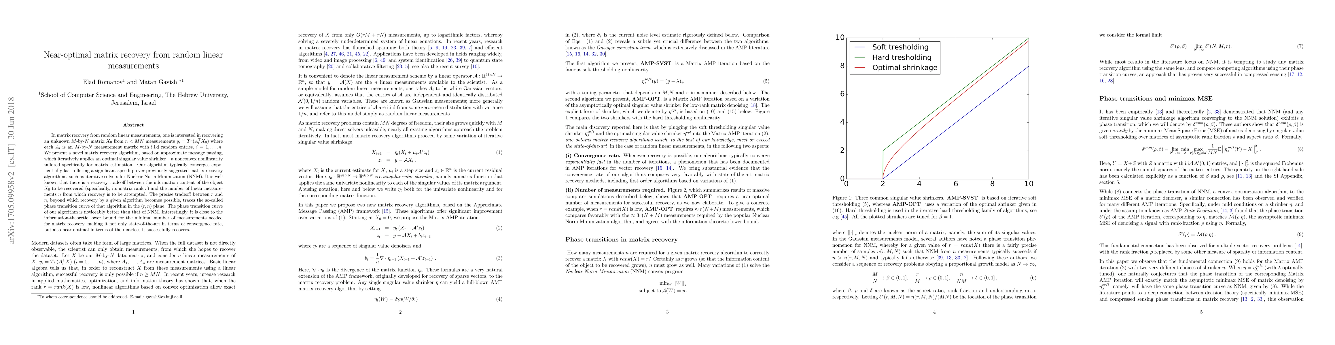 This paper introduces a novel matrix recovery algorithm based on approximate message passing that converges exponentially fast, significantly outperforming traditional Nuclear Norm Minimization methods. The algorithm's phase transition curve is near the information-theoretic lower bound, indicating near-optimal recovery performance.