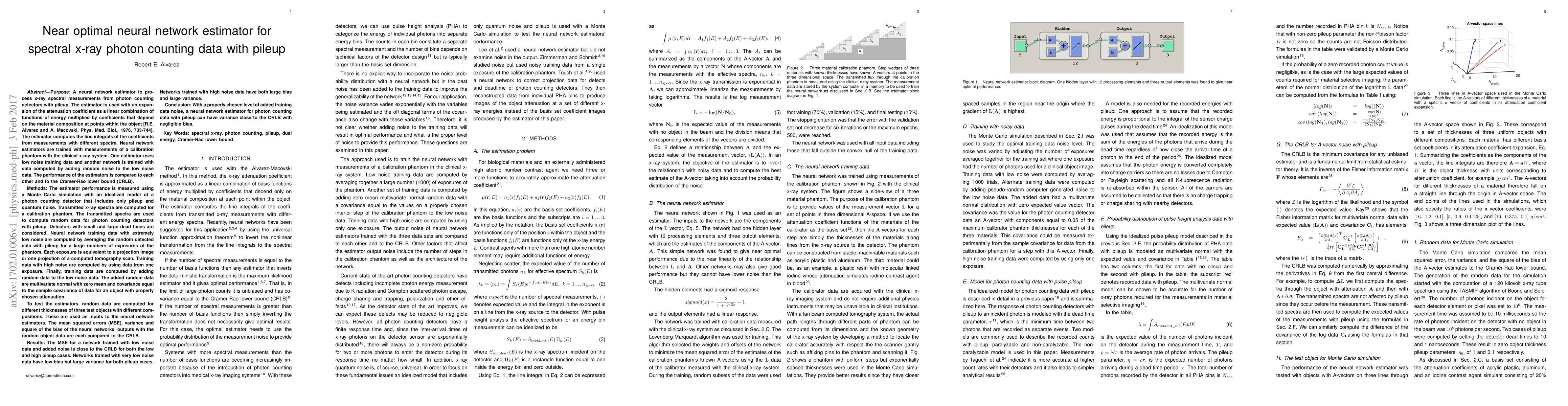 -Purpose: A neural network estimator to process x-ray spectral measurements from photon counting detectors with pileup. The estimator is used with an expansion of the attenuation coefficient as a linear combination of functions of energy multiplied by coefficients that depend on the material composition at points within the object [R.E. Alvarez and A. Macovski, Phys. Med. Biol., 1976, 733-744]. The estimator computes the line integrals of the coefficients from measurements with different spectra. Neural network estimators are trained with measurements of a calibration phantom with the clinical x-ray system. One estimator uses low noise training data and another network is trained with data computed by adding random noise to the low noise data. The performance of the estimators is compared to each other and to the Cramer-Rao lower bound (CRLB). Methods: The estimator performance is measured using a Monte Carlo simulation with an idealized model of a photon counting detector that includes only pileup and quantum noise. Transmitted x-ray spectra are computed for a calibration phantom. The transmitted spectra are used to compute random data for photon counting detectors with pileup. Detectors with small and large dead times are considered. Neural network training data with extremely low noise are computed by averaging the random detected data with pileup for a large numbers of exposures of the phantom. Each exposure is equivalent to a projection image or one projection of a computed tomography scan. Training data with high noise are computed by using data from one exposure. Finally, training data are computed by adding random data to the low noise data. The added random data are multivariate normal with zero mean and covariance equal to the sample covariance of data for an object with properly chosen attenuation. To test the estimators, random data are computed for different thicknesses of three test objects with different compositions. These are used as inputs to the neural network estimators. The mean squared errors (MSE), variance and square of the bias of the neural networks' outputs with the random object data are each compared to the CRLB. Results: The MSE for a network trained with low noise data and added noise is close to the CRLB for both the low and high pileup cases. Networks trained with very low noise data have low bias but large variance for both pileup cases. [email protected] Networks trained with high noise data have both large bias and large variance. Conclusion: With a properly chosen level of added training data noise, a neural network estimator for photon counting data with pileup can have variance close to the CRLB with negligible bias.