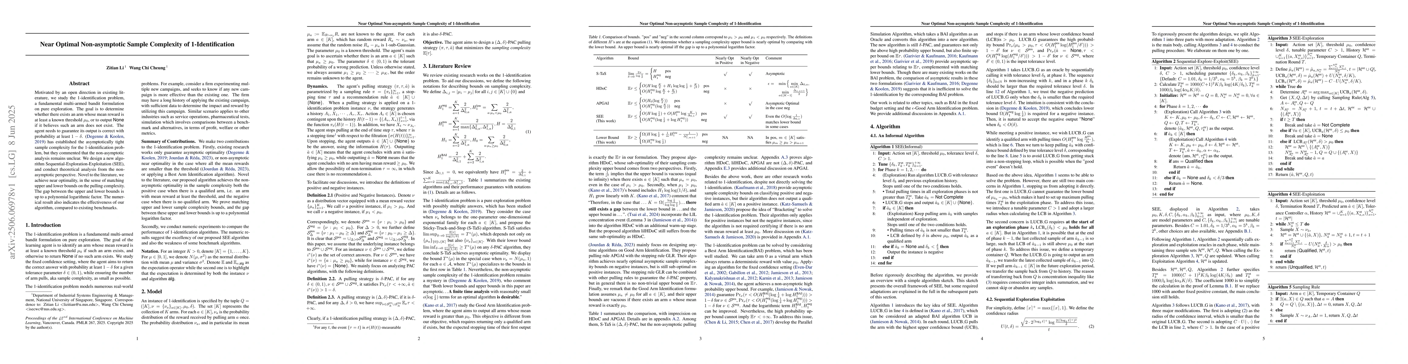 Motivated by an open direction in existing literature, we study the 1-identification problem, a fundamental multi-armed bandit formulation on pure exploration. The goal is to determine whether there exists an arm whose mean reward is at least a known threshold $\mu_0$, or to output None if it believes such an arm does not exist. The agent needs to guarantee its output is correct with probability at least $1-\delta$. Degenne & Koolen 2019 has established the asymptotically tight sample complexity for the 1-identification problem, but they commented that the non-asymptotic analysis remains unclear. We design a new algorithm Sequential-Exploration-Exploitation (SEE), and conduct theoretical analysis from the non-asymptotic perspective. Novel to the literature, we achieve near optimality, in the sense of matching upper and lower bounds on the pulling complexity. The gap between the upper and lower bounds is up to a polynomial logarithmic factor. The numerical result also indicates the effectiveness of our algorithm, compared to existing benchmarks.