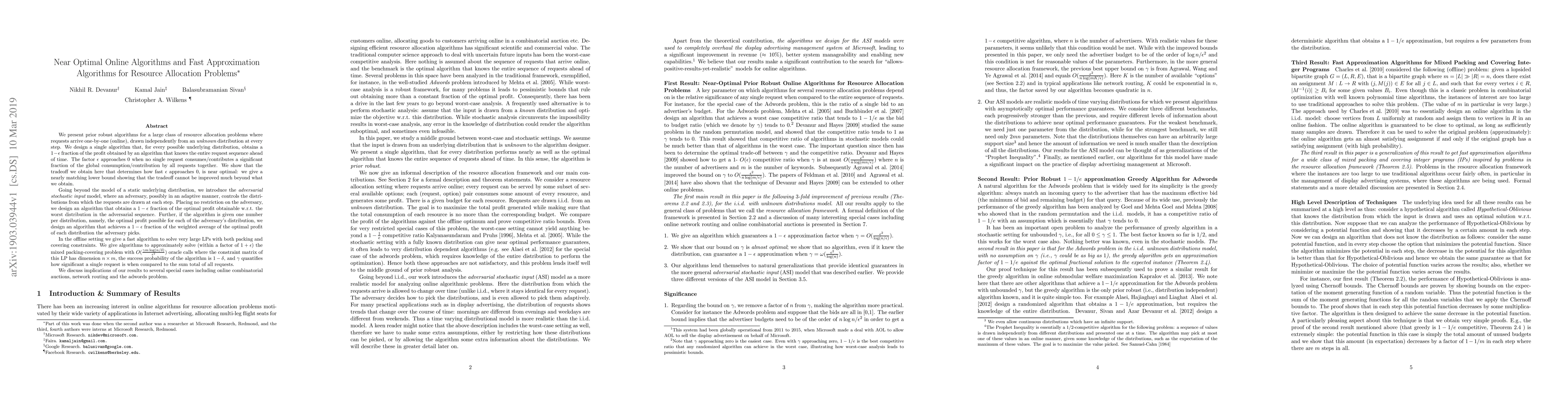 This paper presents near optimal online algorithms for resource allocation problems where requests arrive sequentially and an algorithm must allocate resources without knowing the full request sequence. It also introduces an adversarial stochastic input model and provides a fast approximation algorithm for large linear programs with packing and covering constraints. The results are applied to scenarios like online combinatorial auctions and network routing.