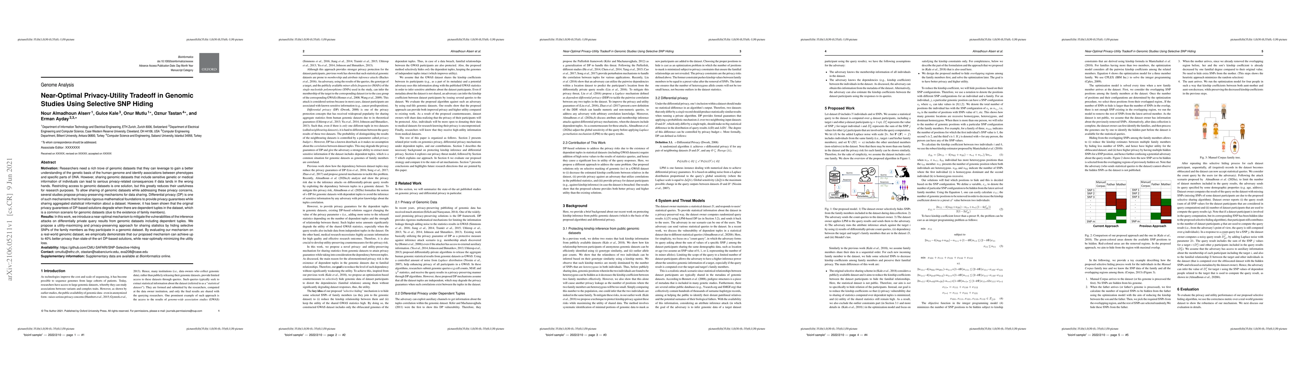 This paper proposes a near-optimal mechanism to enhance privacy in genomic studies by selectively hiding sensitive Single Nucleotide Polymorphisms (SNPs) in datasets with family members. The approach achieves up to 40% better privacy compared to traditional differential privacy methods, while minimizing utility loss.