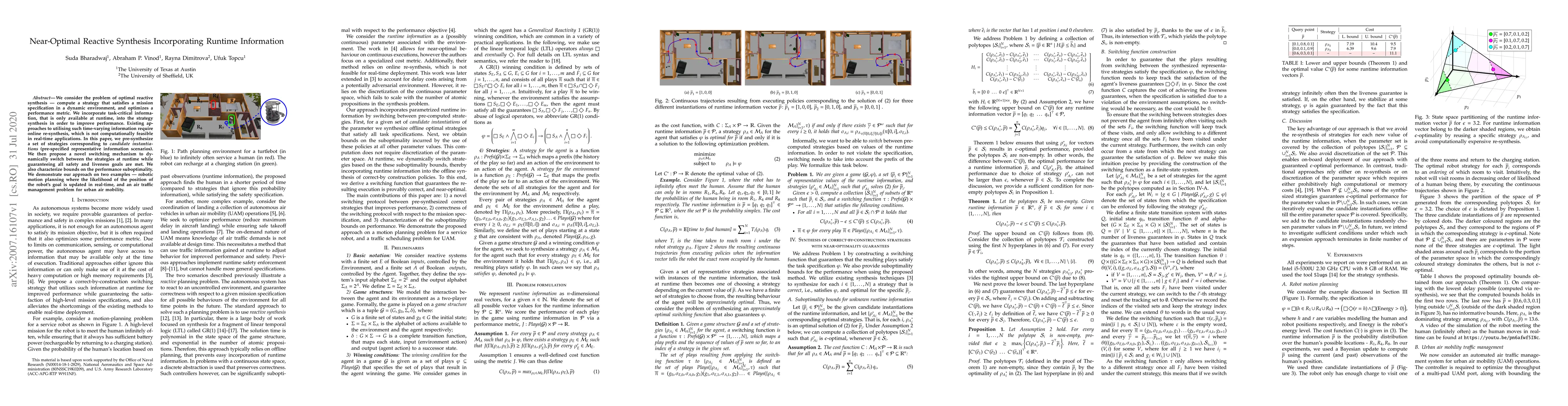 This paper proposes a near-optimal reactive synthesis method that incorporates runtime information to dynamically switch between pre-synthesized strategies, ensuring safety and liveness goals while minimizing performance suboptimality. The approach is demonstrated in robotic motion planning and urban air mobility scenarios.
