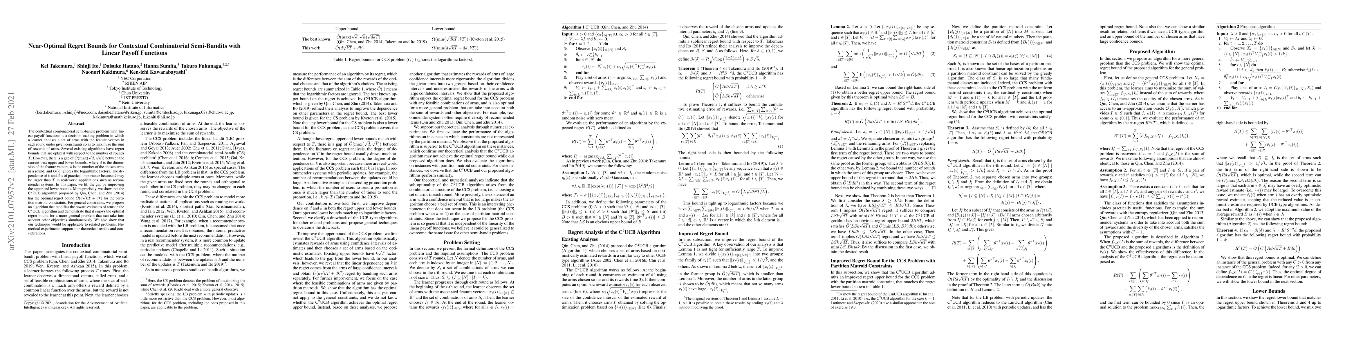 The contextual combinatorial semi-bandit problem with linear payoff functions is a decision-making problem in which a learner chooses a set of arms with the feature vectors in each round under given constraints so as to maximize the sum of rewards of arms. Several existing algorithms have regret bounds that are optimal with respect to the number of rounds $T$. However, there is a gap of $\tilde{O}(\max(\sqrt{d}, \sqrt{k}))$ between the current best upper and lower bounds, where $d$ is the dimension of the feature vectors, $k$ is the number of the chosen arms in a round, and $\tilde{O}(\cdot)$ ignores the logarithmic factors. The dependence of $k$ and $d$ is of practical importance because $k$ may be larger than $T$ in real-world applications such as recommender systems. In this paper, we fill the gap by improving the upper and lower bounds. More precisely, we show that the C${}^2$UCB algorithm proposed by Qin, Chen, and Zhu (2014) has the optimal regret bound $\tilde{O}(d\sqrt{kT} + dk)$ for the partition matroid constraints. For general constraints, we propose an algorithm that modifies the reward estimates of arms in the C${}^2$UCB algorithm and demonstrate that it enjoys the optimal regret bound for a more general problem that can take into account other objectives simultaneously. We also show that our technique would be applicable to related problems. Numerical experiments support our theoretical results and considerations.