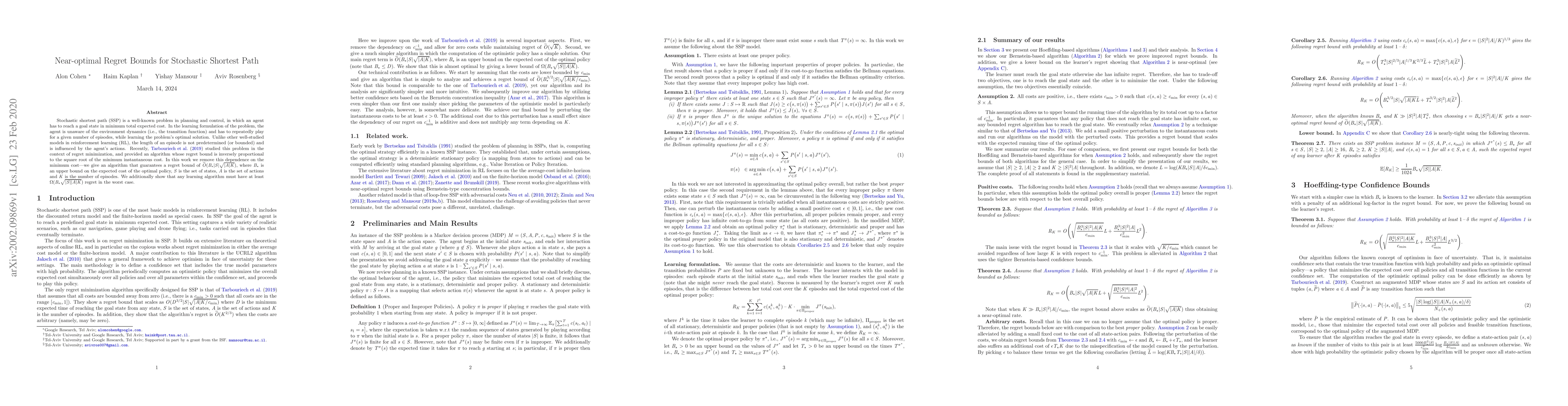 This paper presents an improved algorithm for the stochastic shortest path problem, achieving a regret bound of $\widetilde{O}(B_\star |S| \sqrt{|A| K})$, independent of the minimum instantaneous cost. The authors also prove a lower bound, showing that any algorithm must incur at least $\Omega(B_\star \sqrt{|S| |A| K})$ regret.