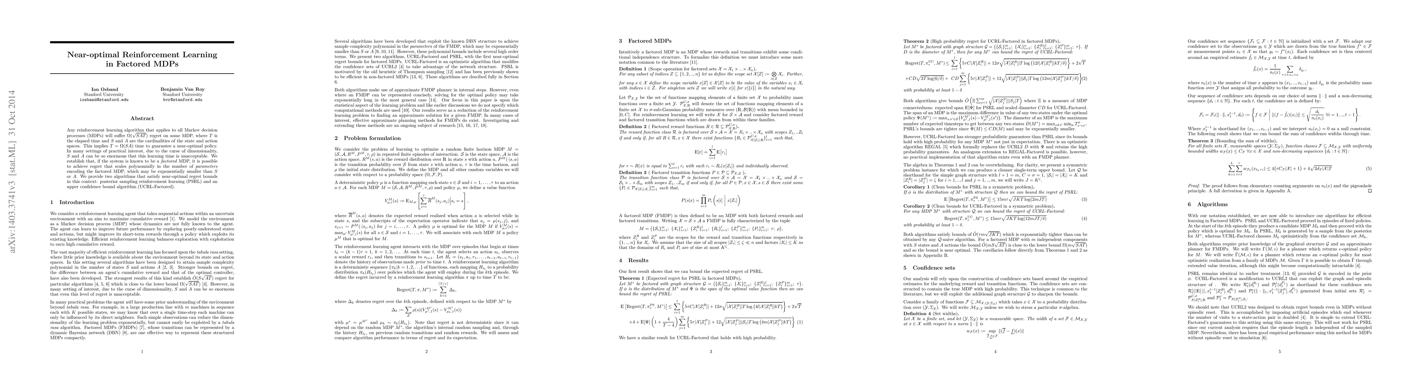 This paper proposes algorithms for near-optimal reinforcement learning in factored MDPs, achieving regret scaling polynomially with the number of parameters, rather than exponentially with the state and action space sizes. The two algorithms presented are PSRL and UCRL-Factored.