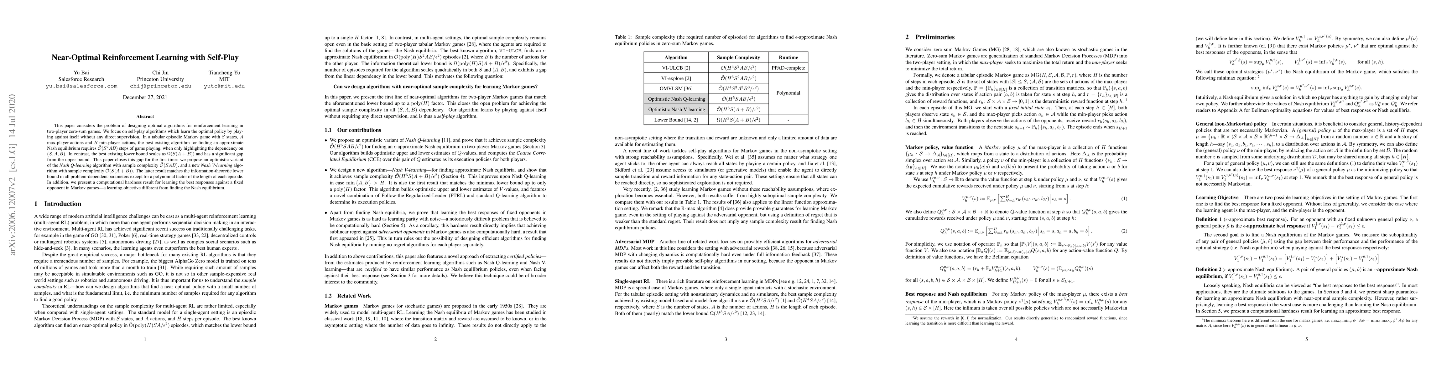This paper proposes new reinforcement learning algorithms for self-play in two-player zero-sum games, achieving near-optimal sample complexities that close the gap between existing upper and lower bounds. The proposed algorithms significantly reduce the number of steps required compared to the best prior methods.