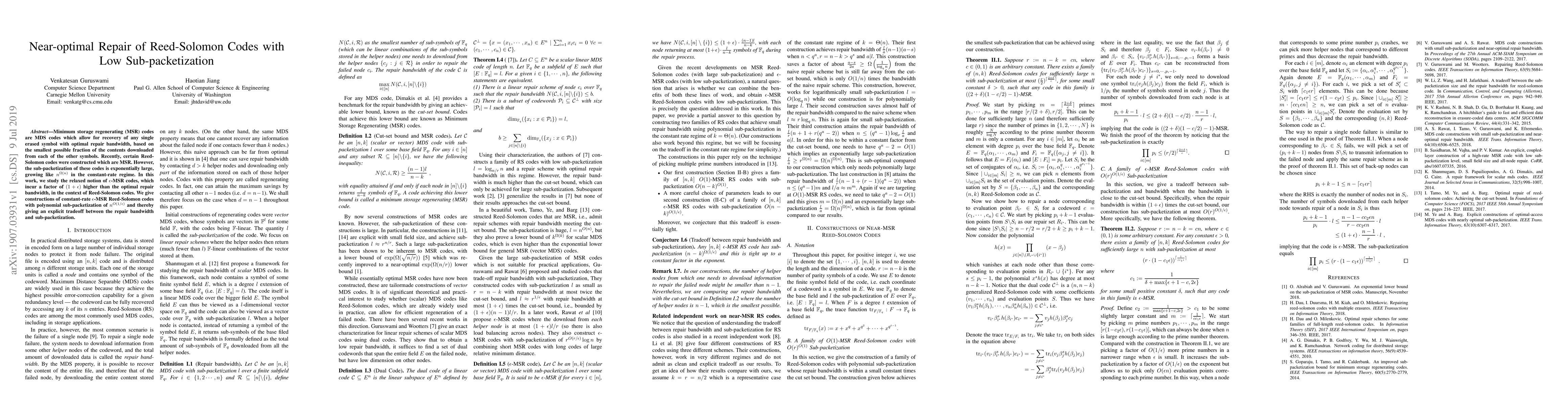 This paper constructs constant-rate $\epsilon$-MSR Reed-Solomon codes that achieve a polynomial sub-packetization of $n^{O(1/\epsilon)}$, providing a tradeoff between repair bandwidth and sub-packetization, improving upon the previously exponentially large sub-packetization of optimal MSR codes.