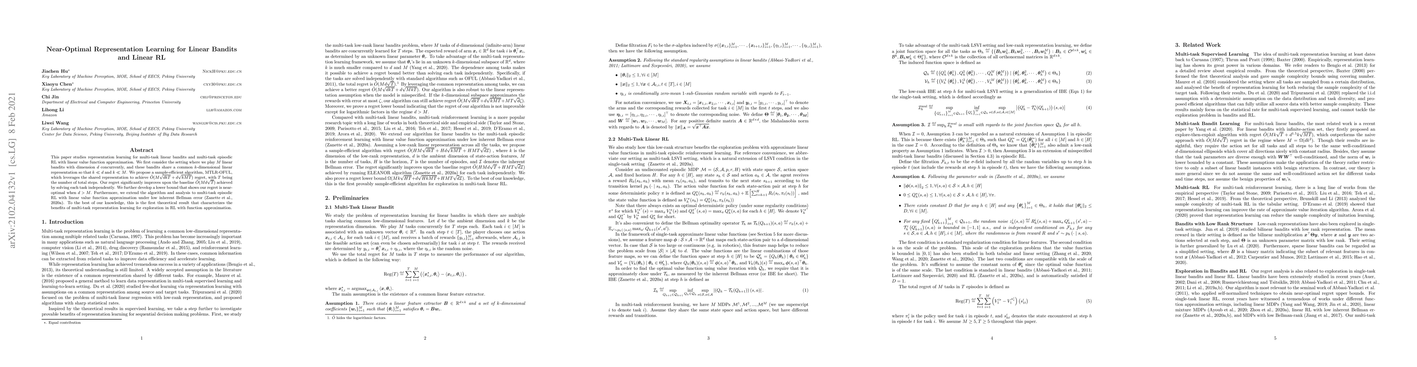 This paper proposes a sample-efficient algorithm, MTLR-OFUL, for multi-task linear bandits and episodic reinforcement learning, leveraging shared representations to achieve near-optimal regret. The algorithm significantly outperforms independent task solutions and provides a near-optimal regret bound when the representation dimension is smaller than the number of tasks.