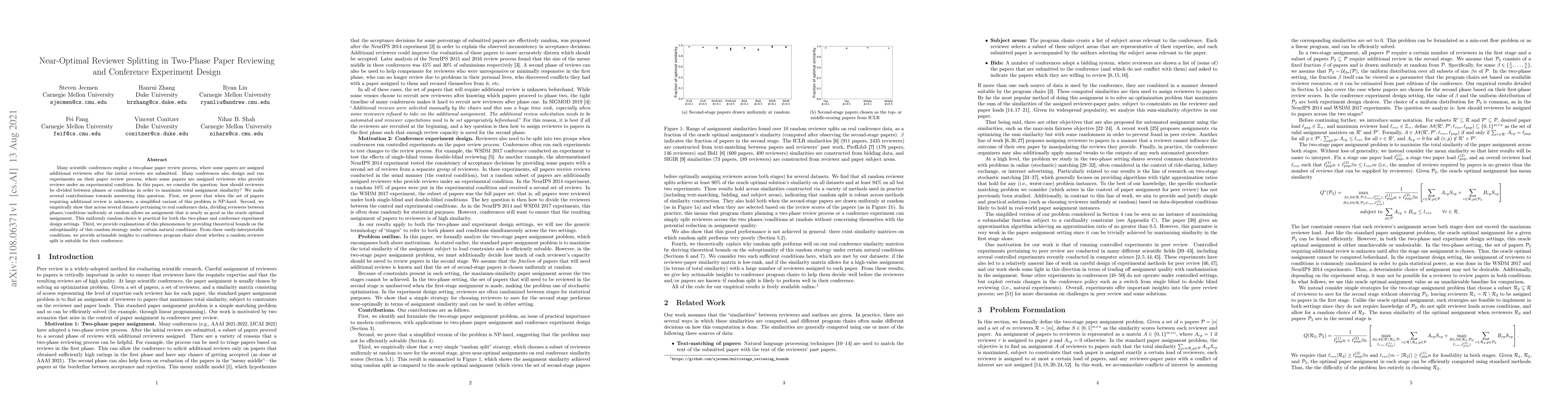 Many scientific conferences employ a two-phase paper review process, where some papers are assigned additional reviewers after the initial reviews are submitted. Many conferences also design and run experiments on their paper review process, where some papers are assigned reviewers who provide reviews under an experimental condition. In this paper, we consider the question: how should reviewers be divided between phases or conditions in order to maximize total assignment similarity? We make several contributions towards answering this question. First, we prove that when the set of papers requiring additional review is unknown, a simplified variant of this problem is NP-hard. Second, we empirically show that across several datasets pertaining to real conference data, dividing reviewers between phases/conditions uniformly at random allows an assignment that is nearly as good as the oracle optimal assignment. This uniformly random choice is practical for both the two-phase and conference experiment design settings. Third, we provide explanations of this phenomenon by providing theoretical bounds on the suboptimality of this random strategy under certain natural conditions. From these easily-interpretable conditions, we provide actionable insights to conference program chairs about whether a random reviewer split is suitable for their conference.