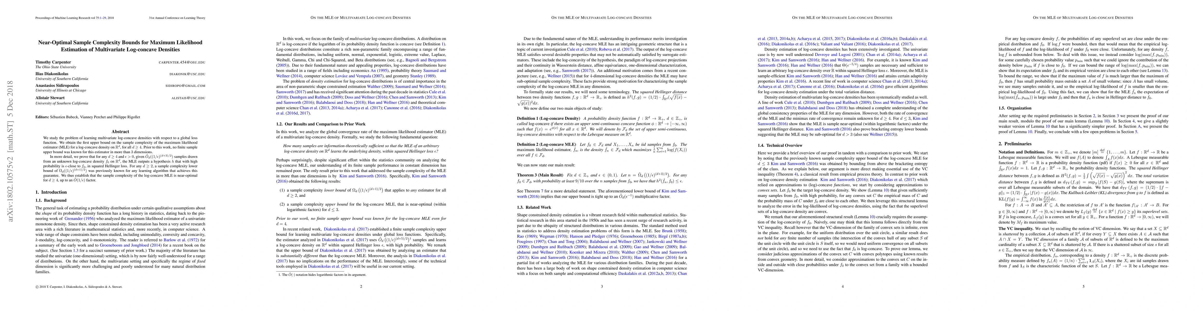 This paper provides the first upper bound on the sample complexity for maximum likelihood estimation of multivariate log-concave densities in dimensions $d \geq 4$, showing near-optimality up to a $\tilde{O}(1/\epsilon)$ factor. It establishes that $\tilde{O}_d((1/\epsilon)^{(d+3)/2})$ samples are sufficient for the estimator to be $\epsilon$-close to the true density in squared Hellinger loss.