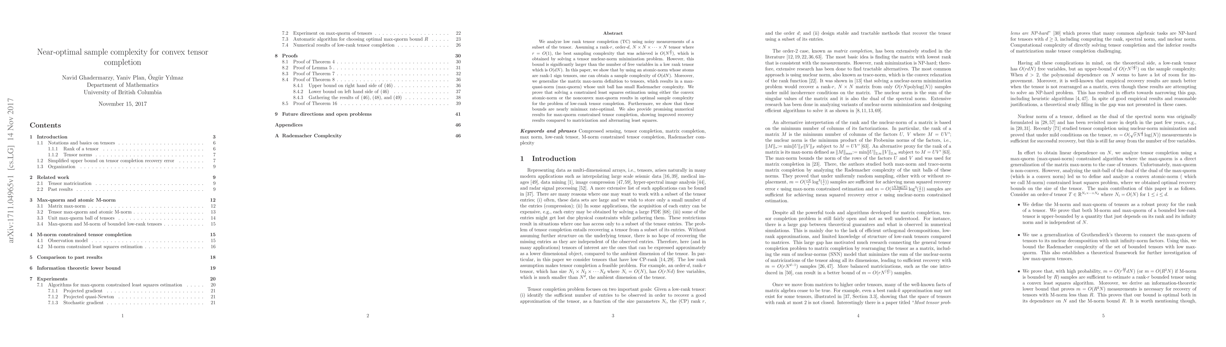 This paper demonstrates near-optimal sample complexity for low-rank tensor completion by introducing an atomic-norm and a generalized max-quasi-norm, achieving a sample complexity of $O(dN)$. It shows that these norms lead to optimal and nearly minimax rate-optimal sample complexity for tensor completion.