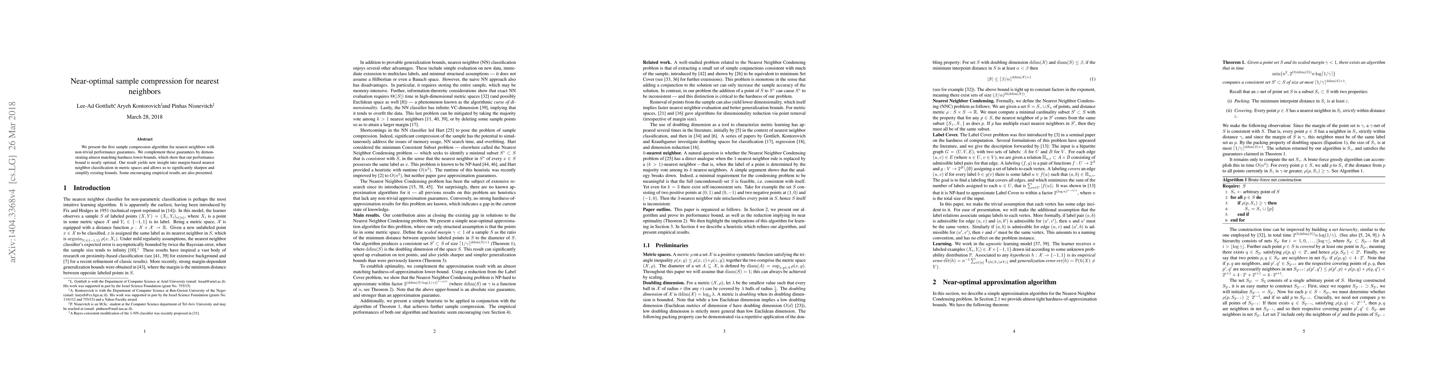 This paper introduces a near-optimal sample compression algorithm for nearest neighbor searches, providing strong performance guarantees and almost matching hardness lower bounds, thus demonstrating near-optimality. It also refines and simplifies existing bounds for margin-based nearest neighbor classification in metric spaces.