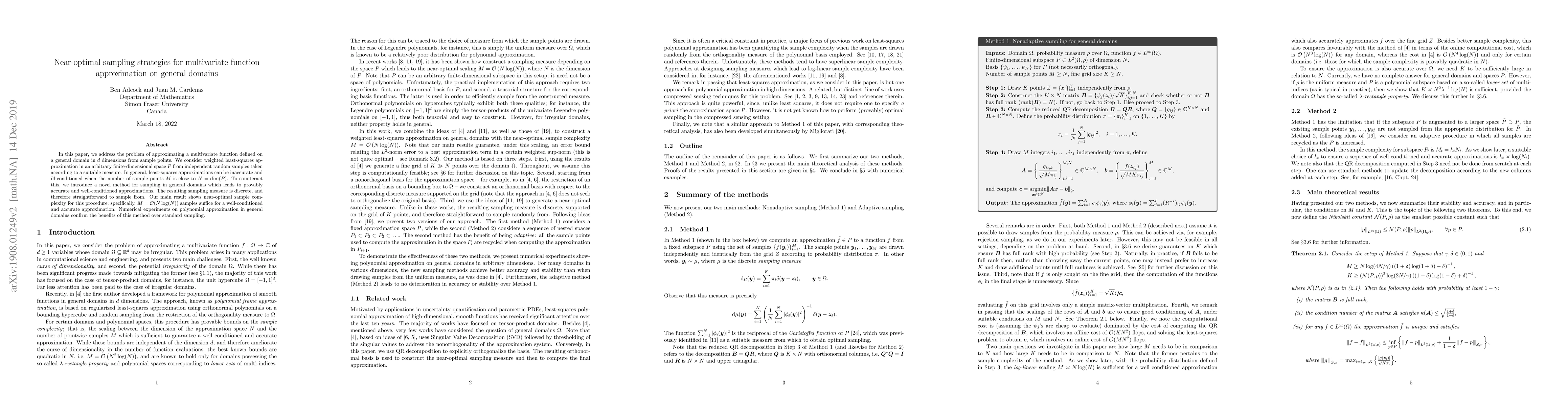 This paper proposes a novel sampling strategy for accurately approximating multivariate functions on general domains, achieving near-optimal sample complexity of $M = \mathcal{O}(N \log(N))$. The method ensures well-conditioned approximations and outperforms standard sampling techniques, as demonstrated by numerical experiments.