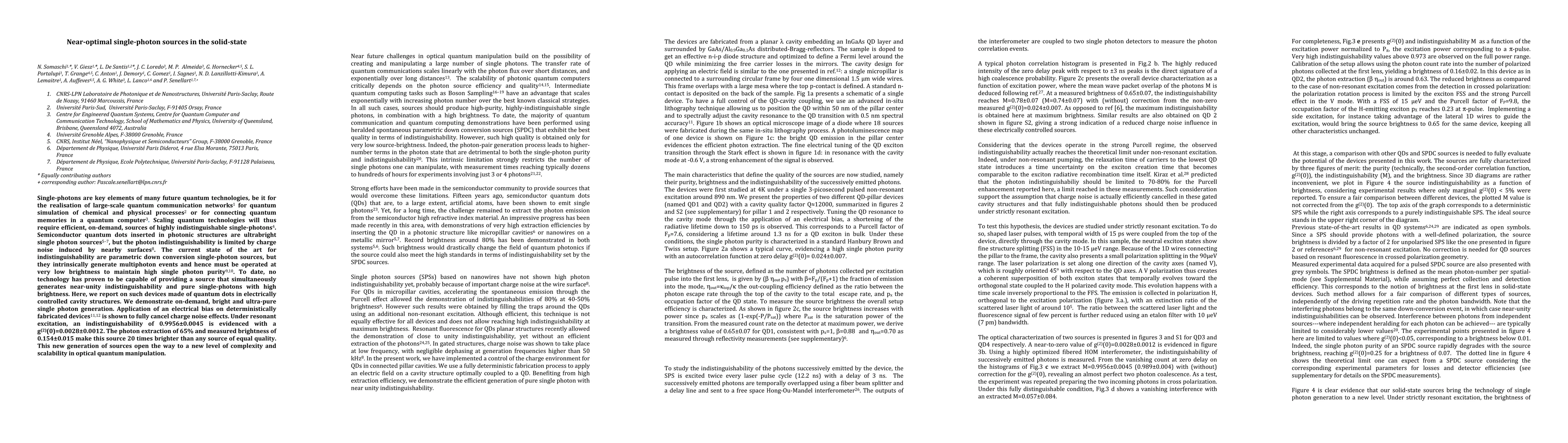 This paper reports on the development of advanced semiconductor quantum dot devices in electrically controlled cavity structures that generate near-unity indistinguishability and pure single photons with high brightness, significantly improving upon existing technologies. The demonstrated devices achieve an indistinguishability of 0.9956 and are 20 times brighter, paving the way for scalable quantum technologies.