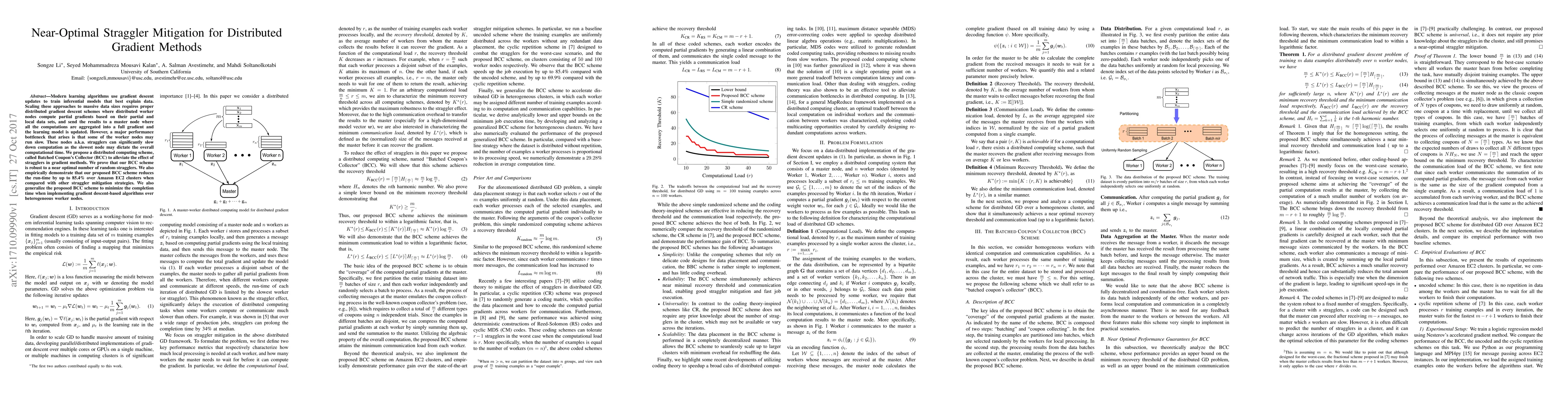 This paper proposes a Batched Coupon's Collector (BCC) scheme to mitigate the impact of stragglers in distributed gradient descent methods, demonstrating near-optimal performance and up to 85.4% reduction in runtime over Amazon EC2 clusters compared to other strategies. The BCC scheme is shown to generalize effectively to minimize completion time in heterogeneous worker node environments.