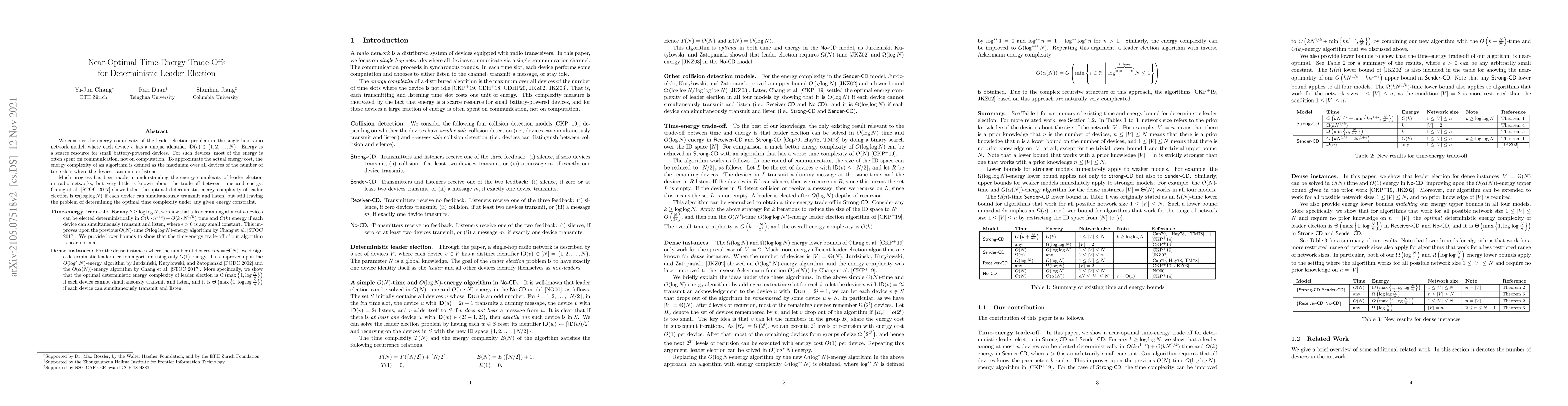 We consider the energy complexity of the leader election problem in the single-hop radio network model, where each device has a unique identifier in $\{1, 2, \ldots, N\}$. Energy is a scarce resource for small battery-powered devices. For such devices, most of the energy is often spent on communication, not on computation. To approximate the actual energy cost, the energy complexity of an algorithm is defined as the maximum over all devices of the number of time slots where the device transmits or listens. Much progress has been made in understanding the energy complexity of leader election in radio networks, but very little is known about the trade-off between time and energy. $\textbf{Time-energy trade-off:}$ For any $k \geq \log \log N$, we show that a leader among at most $n$ devices can be elected deterministically in $O(k \cdot n^{1+\epsilon}) + O(k \cdot N^{1/k})$ time and $O(k)$ energy if each device can simultaneously transmit and listen, where $\epsilon > 0$ is any small constant. This improves upon the previous $O(N)$-time $O(\log \log N)$-energy algorithm by Chang et al. [STOC 2017]. We provide lower bounds to show that the time-energy trade-off of our algorithm is near-optimal. $\textbf{Dense instances:}$ For the dense instances where the number of devices is $n = \Theta(N)$, we design a deterministic leader election algorithm using only $O(1)$ energy. This improves upon the $O(\log^* N)$-energy algorithm by Jurdzi\'{n}ski et al. [PODC 2002] and the $O(\alpha(N))$-energy algorithm by Chang et al. [STOC 2017]. More specifically, we show that the optimal deterministic energy complexity of leader election is $\Theta\left(\max\left\{1, \log \frac{N}{n}\right\}\right)$ if the devices cannot simultaneously transmit and listen, and it is $\Theta\left(\max\left\{1, \log \log \frac{N}{n}\right\}\right)$ if they can.