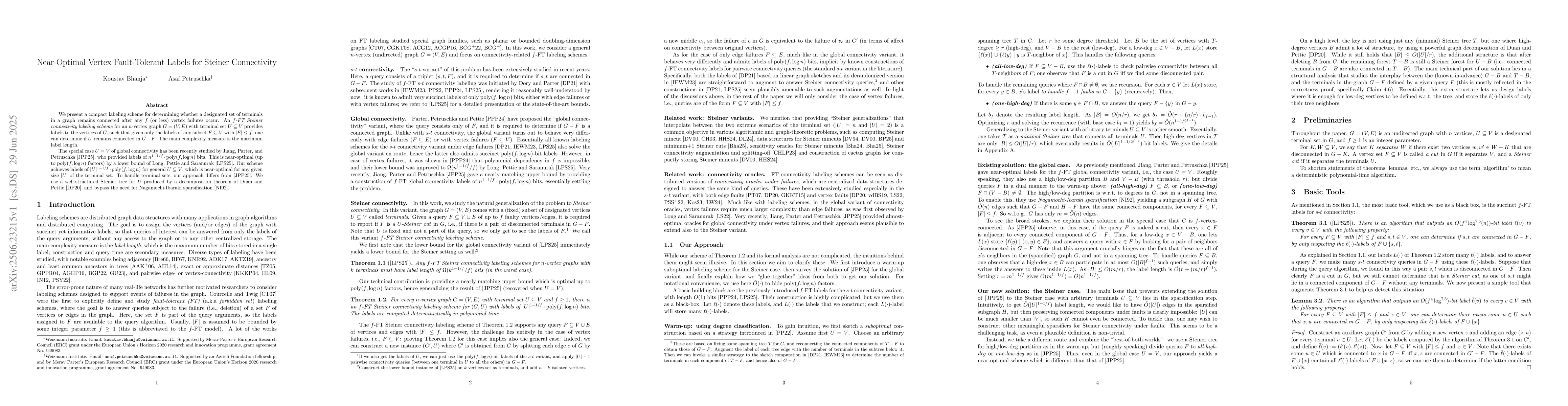 We present a compact labeling scheme for determining whether a designated set of terminals in a graph remains connected after any $f$ (or less) vertex failures occur. An $f$-FT Steiner connectivity labeling scheme for an $n$-vertex graph $G=(V,E)$ with terminal set $U \subseteq V$ provides labels to the vertices of $G$, such that given only the labels of any subset $F \subseteq V$ with $|F| \leq f$, one can determine if $U$ remains connected in $G-F$. The main complexity measure is the maximum label length. The special case $U=V$ of global connectivity has been recently studied by Jiang, Parter, and Petruschka, who provided labels of $n^{1-1/f} \cdot \mathrm{poly}(f,\log n)$ bits. This is near-optimal (up to $\mathrm{poly}(f,\log n)$ factors) by a lower bound of Long, Pettie and Saranurak. Our scheme achieves labels of $|U|^{1-1/f} \cdot \mathrm{poly}(f, \log n)$ for general $U \subseteq V$, which is near-optimal for any given size $|U|$ of the terminal set. To handle terminal sets, our approach differs from Jiang et al. We use a well-structured Steiner tree for $U$ produced by a decomposition theorem of Duan and Pettie, and bypass the need for Nagamochi-Ibaraki sparsification.