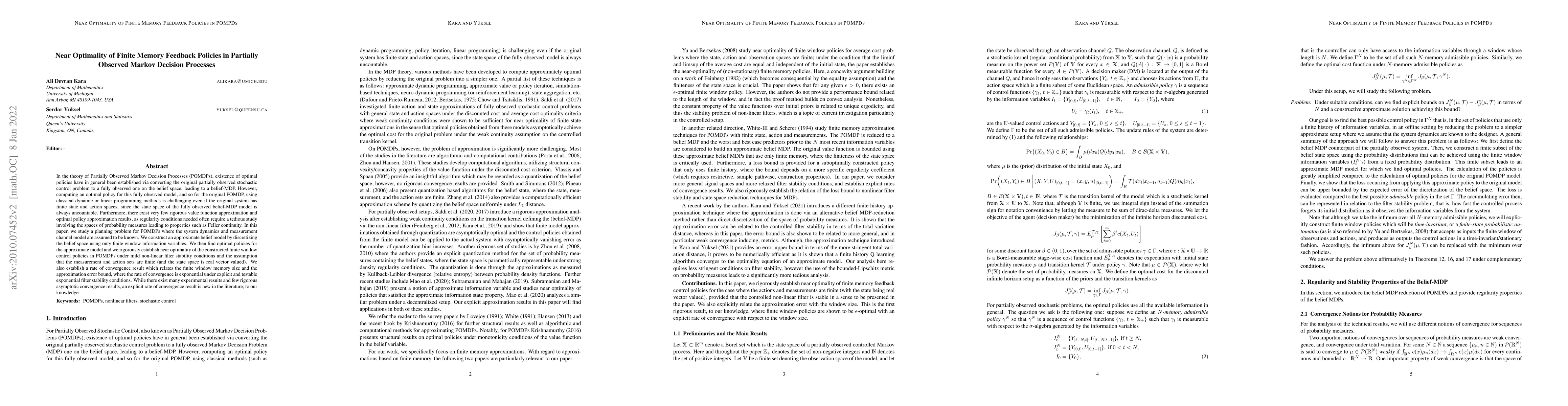This paper investigates finite memory feedback policies for Partially Observed Markov Decision Processes (POMDPs), constructing an approximate belief model using finite window information. It establishes near optimality and an exponential rate of convergence for these policies under mild stability conditions, providing a novel explicit rate of convergence result.