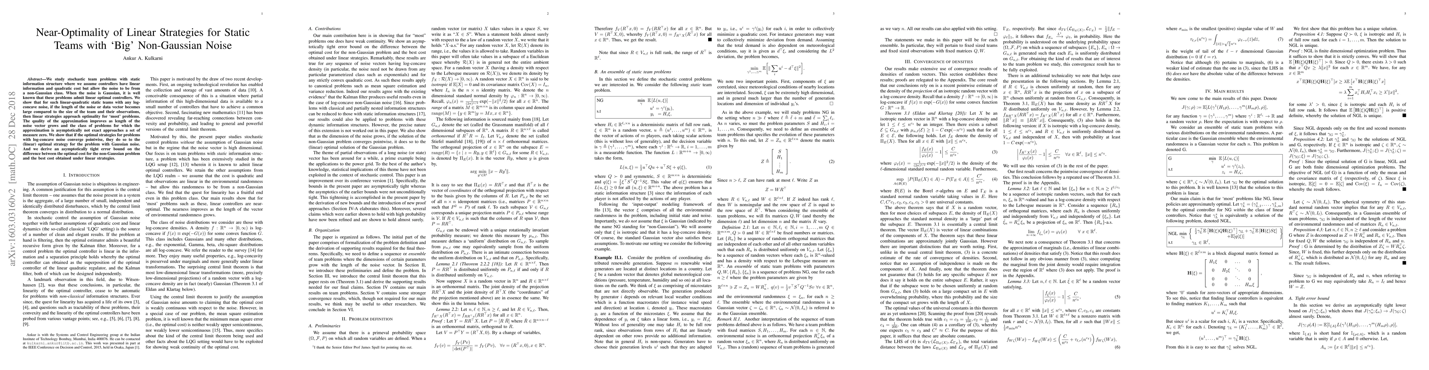 This paper investigates linear strategies for static team problems under non-Gaussian noise, demonstrating that linear strategies approach optimality as the noise vector length increases relative to the team size. The study shows that for log-concave noise, linear strategies converge to the optimal Gaussian noise strategy and provides an asymptotically tight error bound for the cost difference.