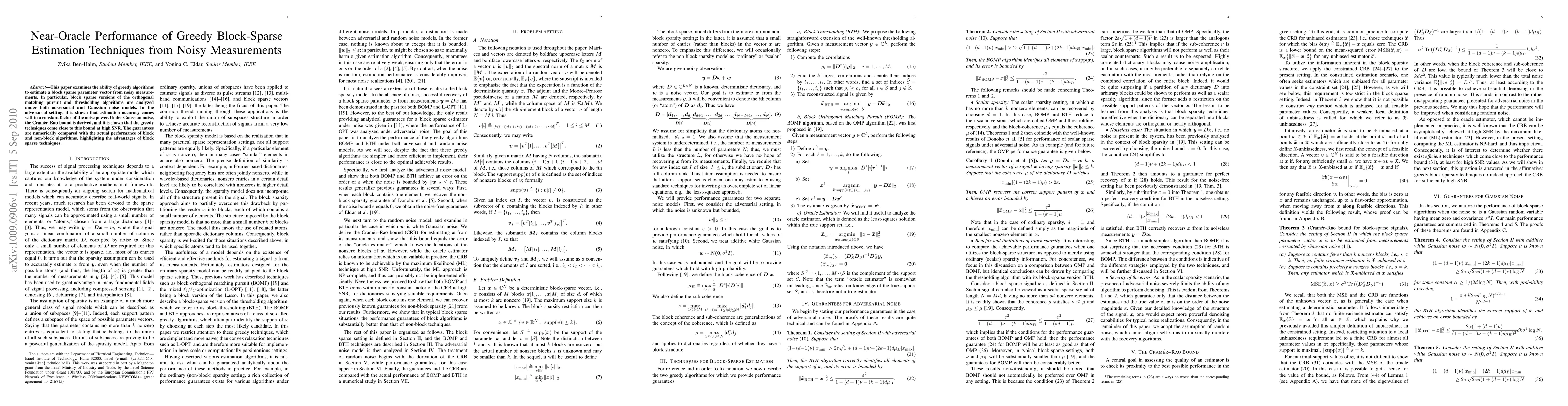 This paper analyzes the performance of greedy block-sparse estimation algorithms under noisy conditions, demonstrating near-optimal performance close to theoretical bounds in both adversarial and Gaussian noise scenarios. The study highlights the advantages of block sparse techniques over non-block methods.