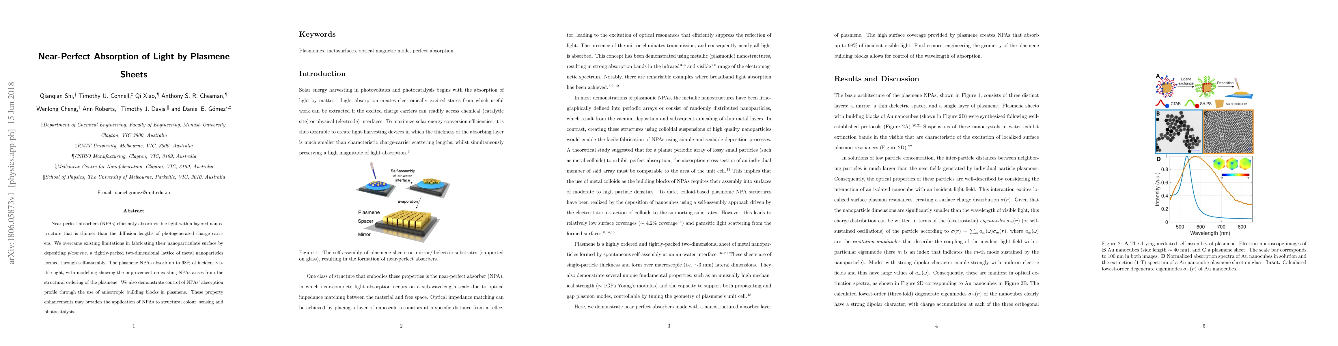 Near-perfect absorbers (NPAs) efficiently absorb visible light with a layered nanostructure that is thinner than the diffusion lengths of photogenerated charge carriers. We overcame existing limitations in fabricating their nanoparticulate surface by depositing \textit{plasmene}, a tightly-packed two-dimensional lattice of metal nanoparticles formed through self-assembly. The plasmene NPAs absorb up to 98\% of incident visible light, with modelling showing the improvement on existing NPAs arises from the structural ordering of the plasmene. We also demonstrate control of NPAs' absorption profile through the use of anisotropic building blocks in plasmene. These property enhancements may broaden the application of NPAs to structural colour, sensing and photocatalysis.